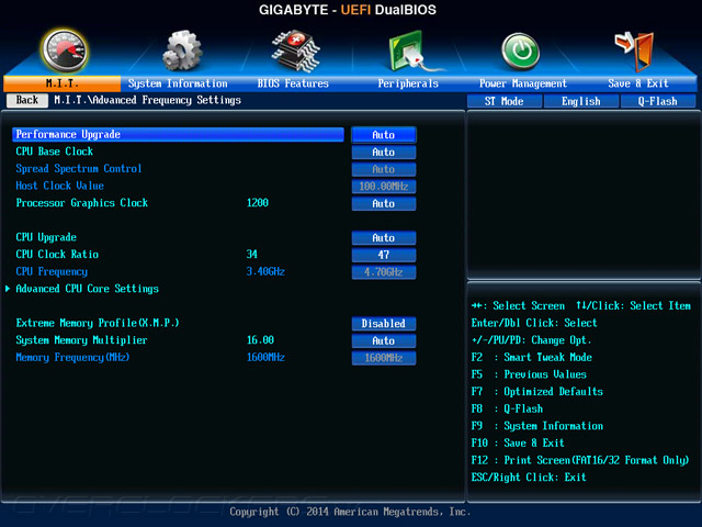 Следующим проверенным режимом будет активация профиля Performance Upgrade в среде UEFI. Положение 100% Upgrade позволяет функционировать Core i5-4670K на частоте 4,7 ГГц при напряжении питания 1,42 В. Блок Uncore аналогично прошлому пункту разгоняется до 4 ГГц, а для оперативной памяти активируется всё такой же проверенный режим её работы: частота, согласно профилю XMP, составляет 2133 МГц, конфигурация задержек обретает иные значения — 11-14-14-36-1Т, отличающиеся от записанных в готовый профиль. Напряжение питания составляет 1,65 В.