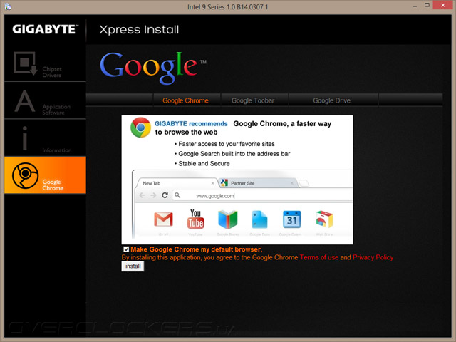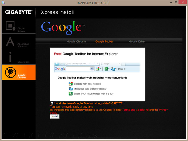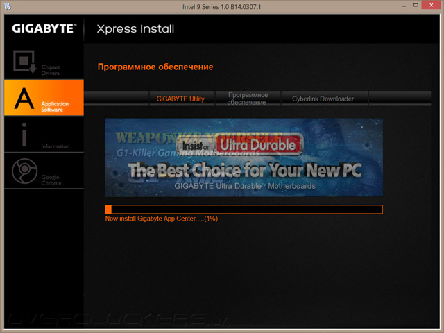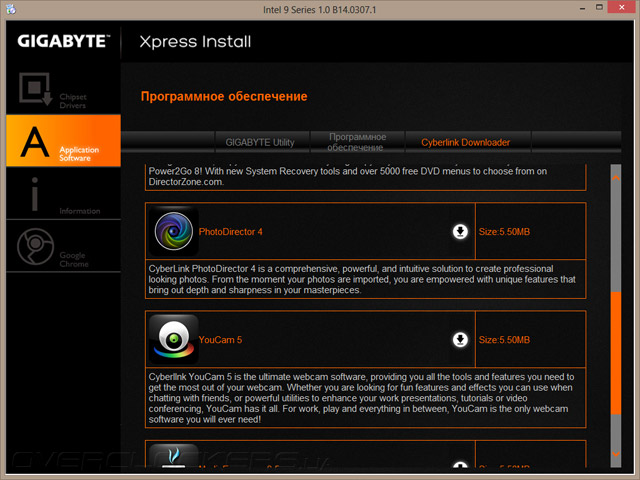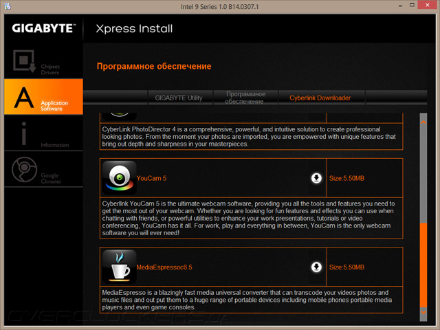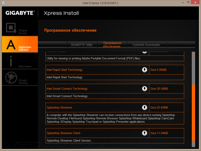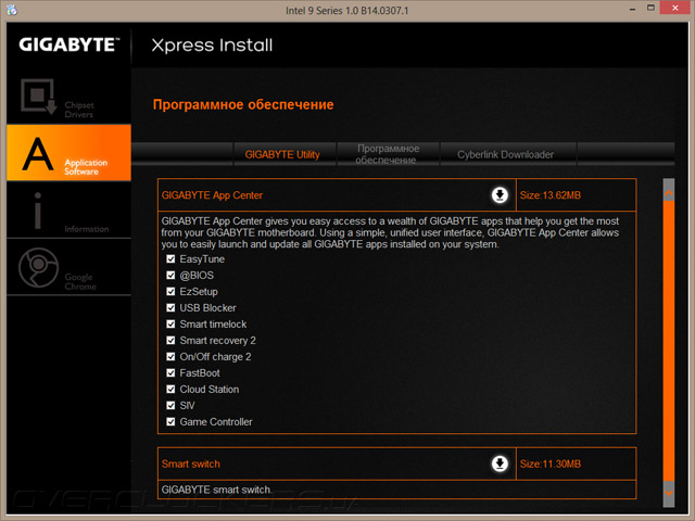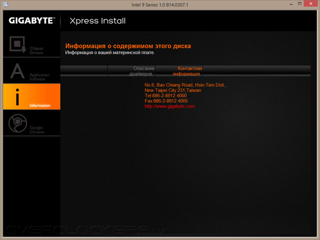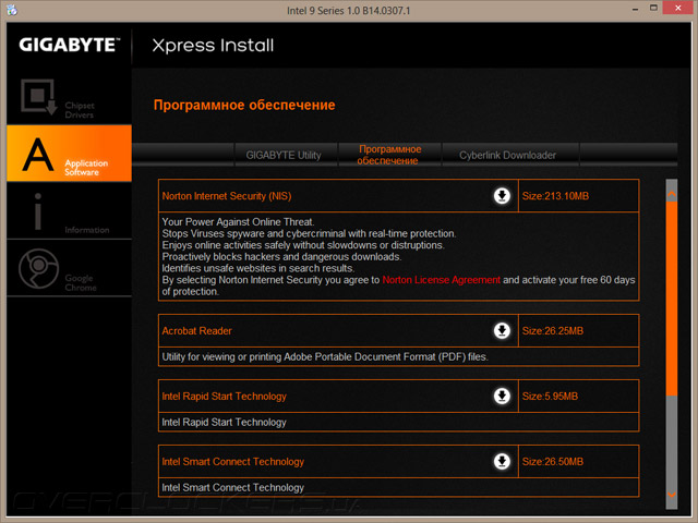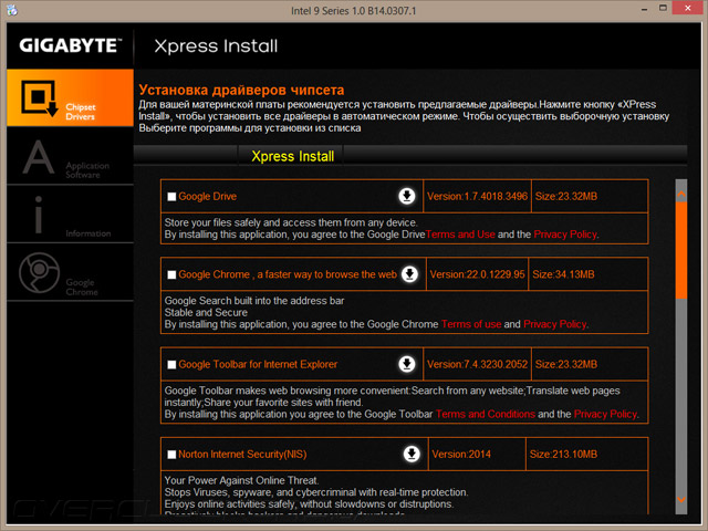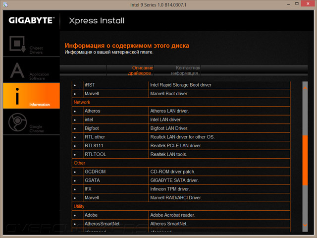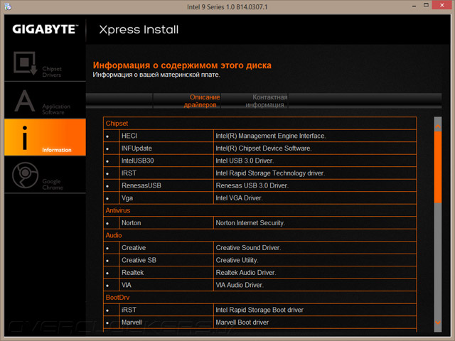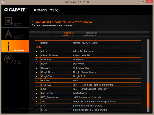 Производитель не стал вносить никаких изменений во внешний облик элементов интерфейса меню, где отображено содержимое компакт-диска. По отдельным категориям рассредоточены драйверы, разнообразное программное обеспечение, как выпускаемое подконтрольно Gigabyte, так и от сторонних производителей. Как это было прежде, на диске находится избыточный набор драйверов, предназначенный для различных систем. Проблем при работе мастеров установки не возникло.