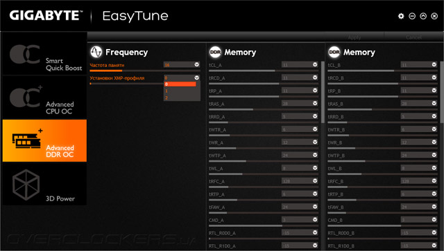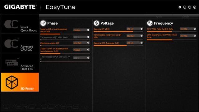 В завершении взглянем на остатки от комплекса EasyTune. Благодаря небольшому пересмотру концепции, в особенности — высвобождению нижней части окна от мониторинга за всеми параметрами, теперь появилось больше места для увеличения размеров элементов интерфейса, которые прежде ютились в едином окне режима Advanced. Теперь же даже его разбили на две разных вкладки — CPU OC и DDR OC. Также не обошлось без 3D Power, где дублируются настройки стабилизатора питания ЦП.