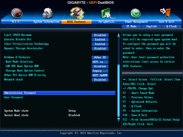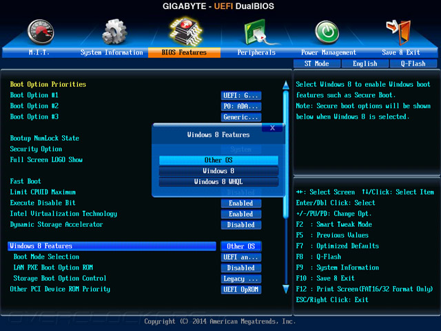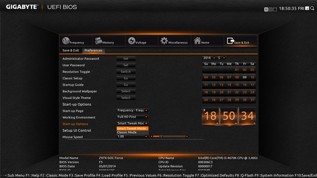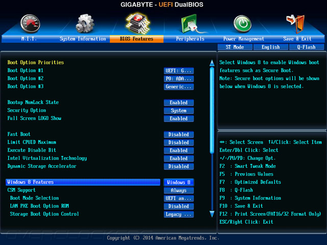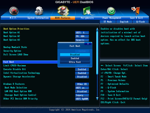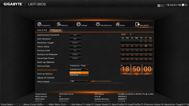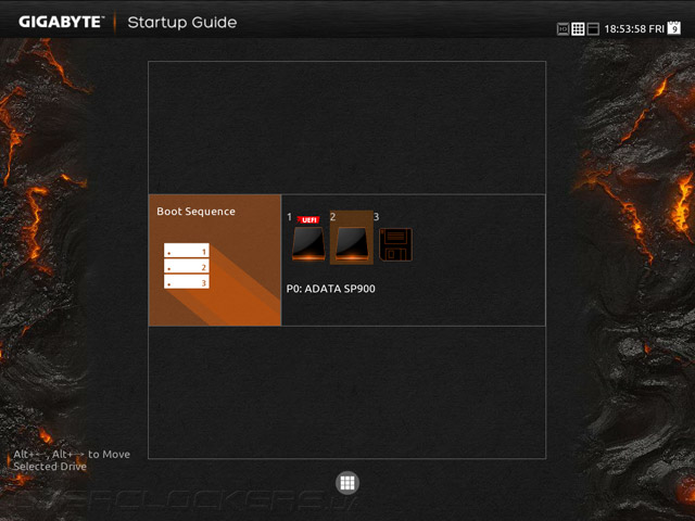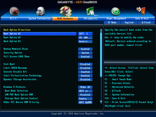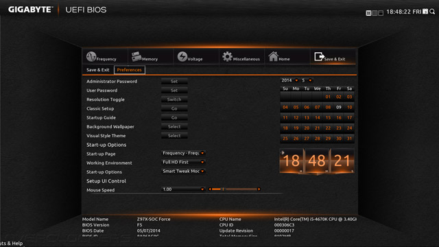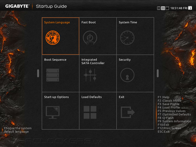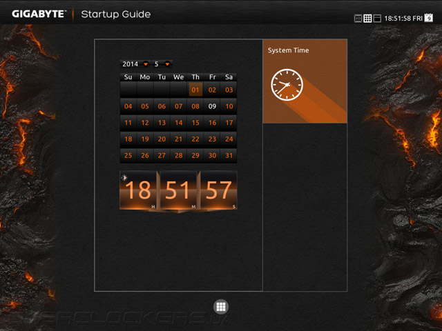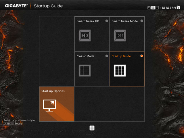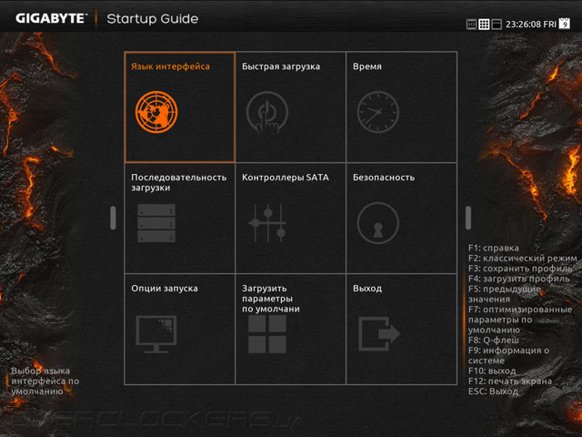 Итак, при входе в UEFI теперь продукция Gigabyte встречает пользователя эдаким мастером по быстрой настройке системы. Дизайнеры не стали придумывать ничего нового — они продолжают, по всей видимости, черпать вдохновение из последнего фирменного Modern UI компании Microsoft. Такой режим лаконично назвали Startup Guide, и на роль полноценного конкурента EZ Mode — модификации упрощённого режима отображения настроек UEFI от ASUS — в принципе претензий быть не может. Здесь по собственным ячейкам расположены: выбор языка интерфейса, активация (именно активация, поскольку по умолчанию всё отключено) режима быстрой загрузки, установка корректных времени и даты, распределение приоритета среди загрузочных устройств, проверка режима функционирования контроллера SATA, назначение пароля для доступа к настройкам системы, выбор среди режимов отображения UEFI при (последующем) входе в UEFI и сброс всех настроек. Не сказать, что такой набор богат, скорее минималистичен. Вероятно, существуют пользователи, которым наверняка пригодится такой гид, но вряд ли оверклокеры входят в их число. Негативной чертой в появлении этого режима является тот факт, что после сброса настроек к их штатным значениям придётся каждый раз, вновь и вновь, проходить процедуру такой «настройки», во всяком случае — этап по выбору языка (обязательный первый шаг) и последующую модификацию Start-up Options. Это очень неудобно, особенно в системе, нацеленной на постоянные эксперименты.