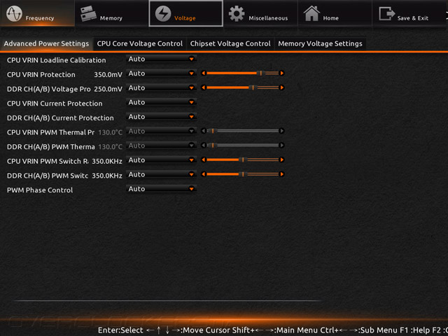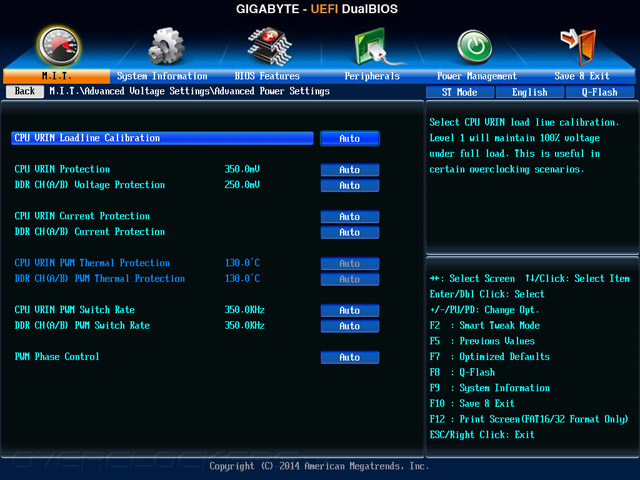 Свой отпечаток накладывает улучшенная система по стабилизации питающего напряжения ЦП, для которой есть собственный раздел с настройками. Подобный присутствует не только у оверклокерских моделей, но и у G1.Sniper 5, которая являлась по сути флагманом линейки системных плат на основе Z87 и обладала очень солидным модулем VRM.