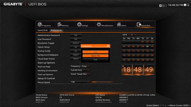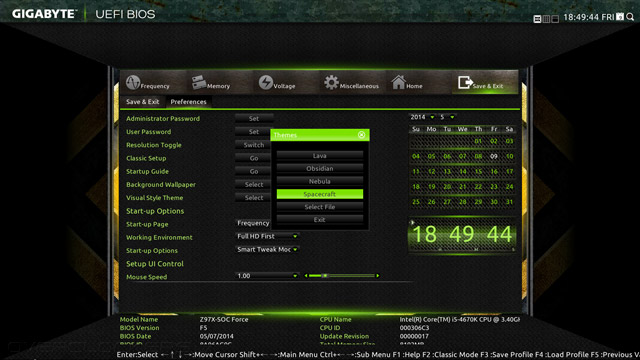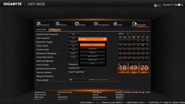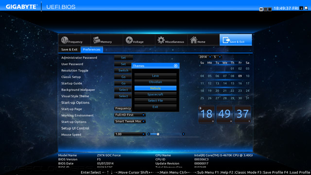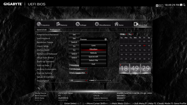 Там можно настроить чувствительность мыши, установить стартовую страницу (актуально когда именно ST Mode будет действующим режимом отображения UEFI), определиться с расширением экрана (высокое или низкое) — и, тем самым, с методом отображения элементов меню, а также поменять стиль оформления окружения. Теперь заготовлено четыре темы, вероятно, прежде отсутствующая Obsidian предназначена для новой серии Black Edition от Gigabyte. Помимо этих можно подгрузить и другое, прежде заготовленное изображение.