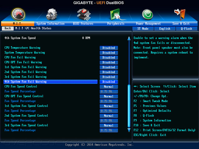 Несколько подробнее о характере GA-Z97X-SOC Force в сфере управления разнообразными вентиляторами. Плата оснащена шестью каналами, при этом процессорный обладает исключительной возможностью производить управление посредством метода ШИМ, а вот все остальные гнёзда используют способ изменения питающего напряжения, несмотря на их четырёхконтактное исполнение. В этом несложно убедиться произведя калибровку одной единицы на разных местах подключения.