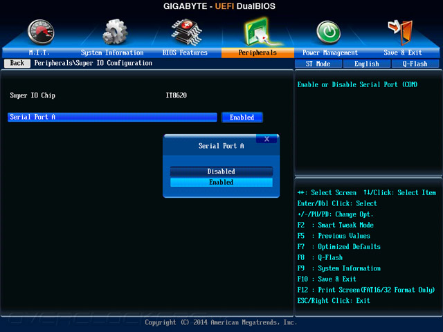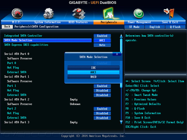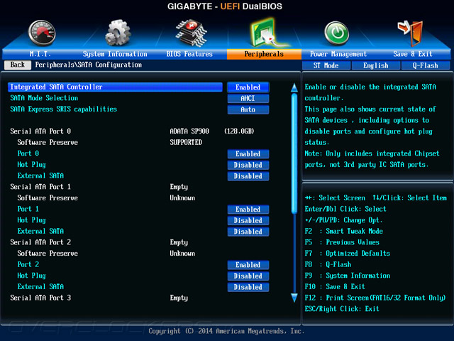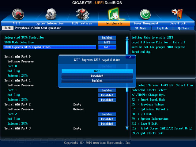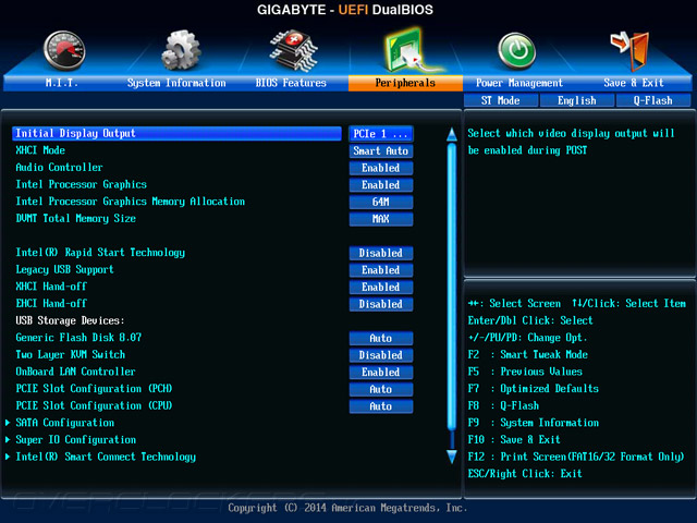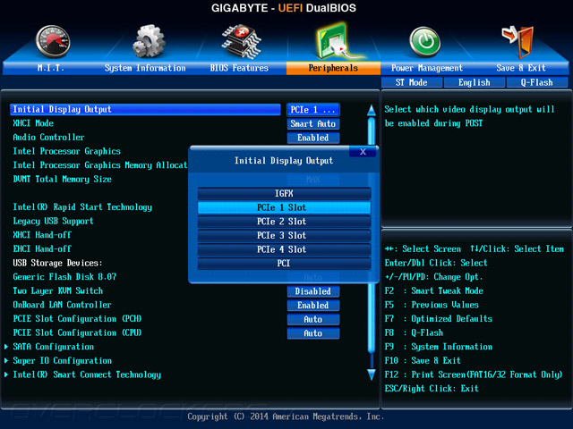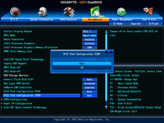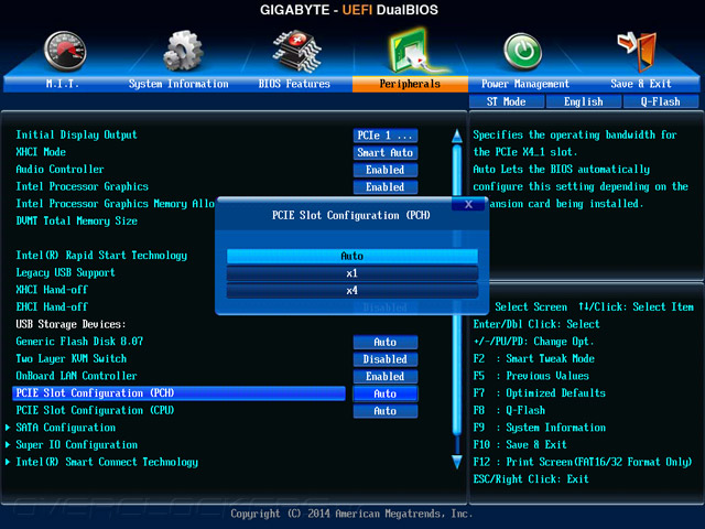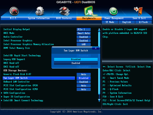 Страница Peripherals неожиданно успела обзавестись некоторыми интересными пунктами. Появилась возможность активировать, вероятно, некий режим совместимости с KVM Switch, обозначенный как Two Layer. Кроме этого, можно форсировать работу PCIEX4 слотов в понравившемся режиме. Отчего-то в UEFI написано о принадлежности первого слота к структуре PCH, вероятно это опечатка; во всяком случае налицо разная трактовка между руководством и справкой UEFI.