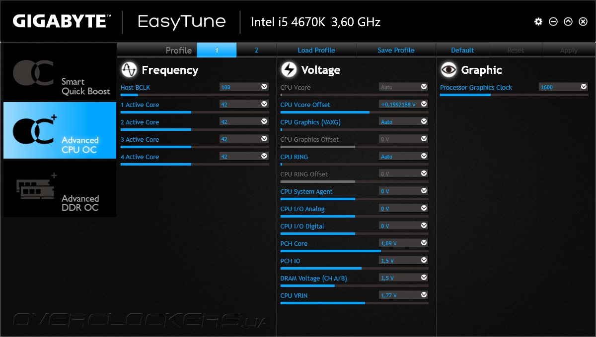 На практике речь идёт о намного более скромном числе — 4200 МГц, но совершенно «честном», не меняющемся в зависимости от типа нагрузки на систему. Для Uncore происходит повышение частоты до 4,0 ГГц, но напряжение этого узла остаётся штатным, лишь для ядер оно, как и в только что изученном готовом профиле, возрастает на 0,2 В.