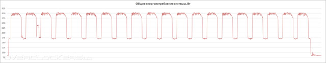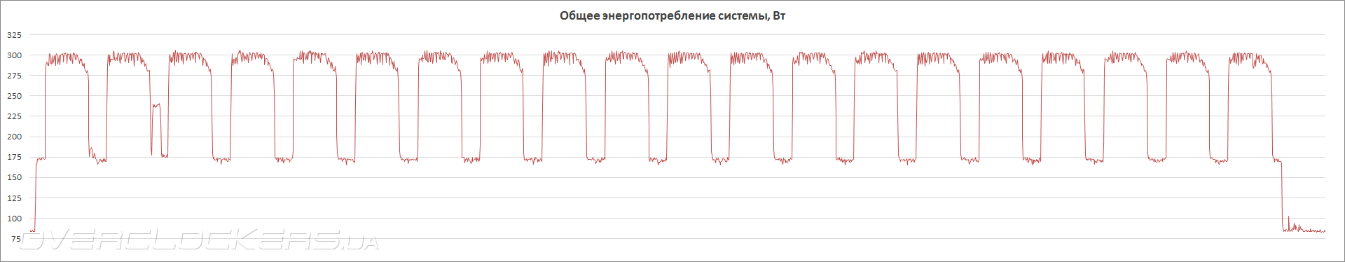 Замеры выполнялись после прохождения всех прочих тестов в «устоявшемся» режиме компьютера при помощи прибора собственной разработки. Методика заключалась в фиксации средневзвешенного значения потребления тестового стенда «от розетки» во время прохождения теста Prime95 с применением профиля In-place large FFTs а также при простое компьютера после завершения теста.