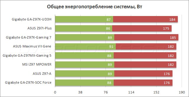 Не самый эффективный преобразователь питания не замедлил сказаться на уровне потребляемой электроэнергии. У платы есть лишь один компонент, влияющий на повышение итоговой цифры — активированная встроенная видеокарта от Intel. Её отключение лишь немного понижает цифры — до отметок 83–181 Вт. Впрочем, такое положение дел преступным назвать нельзя, следует лишь знать о таких особенностях изделия.