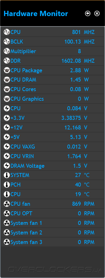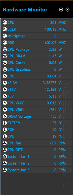 Следует знать: весь комплекс умеет сворачиваться в компактное окно, прижимающееся к правому краю рабочего стола. Такой эффект автоматически срабатывает при запуске Easy Tune. Не сказать, что список параметров исчерпывающий, и с отображением напряжения ЦП имеются проблемы.