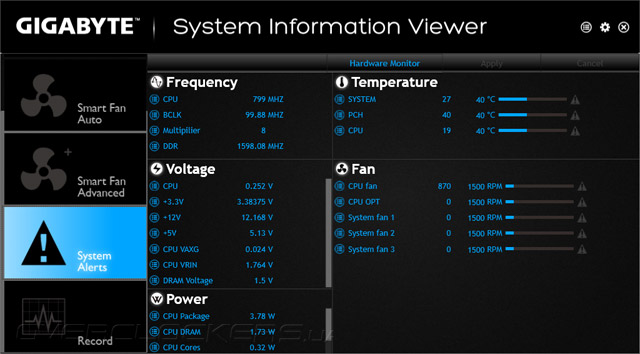 Довершает список возможностей инструмент по мониторингу за важнейшими из параметров, где можно установить «тревогу», срабатывающую в виде всплывающего окна на рабочем столе в случае выхода значения за указанные рамки. С помощью самописца можно активировать запись значений в журнал с их отображением на графике кривых, но кроме активации/деактивации избранного параметра других настроек практически нет.