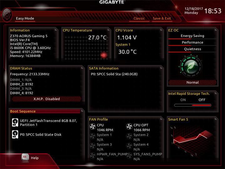 Присутствует базовый режим настройки системы, именуемый Easy Mode. Можно будет разобраться с загрузочными устройствами, активировать XMP.