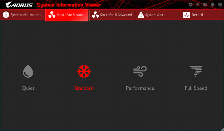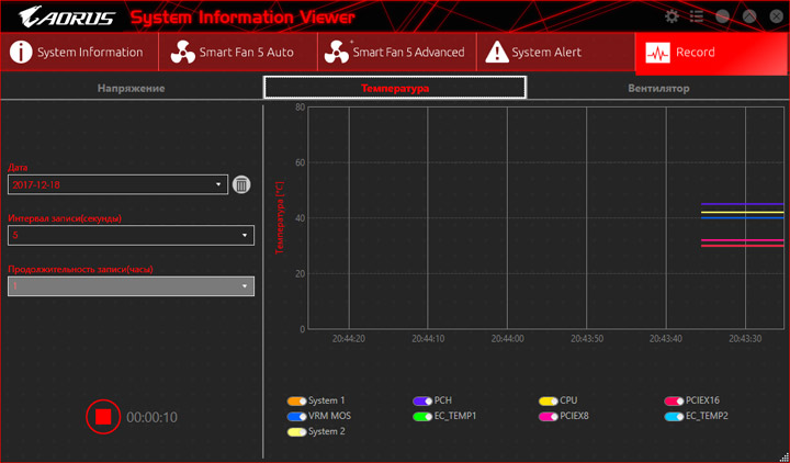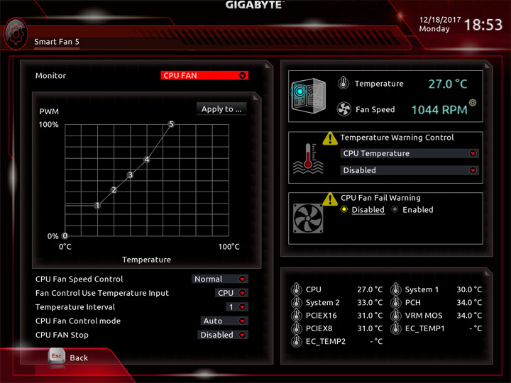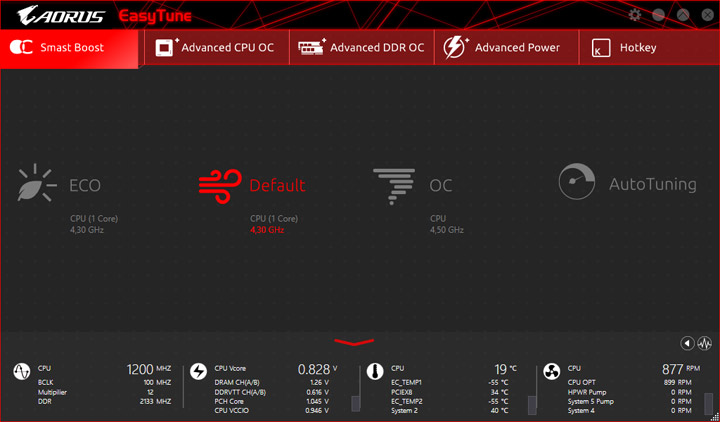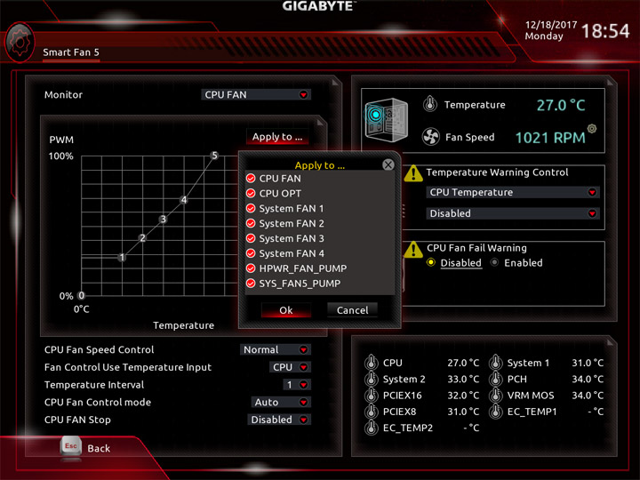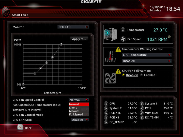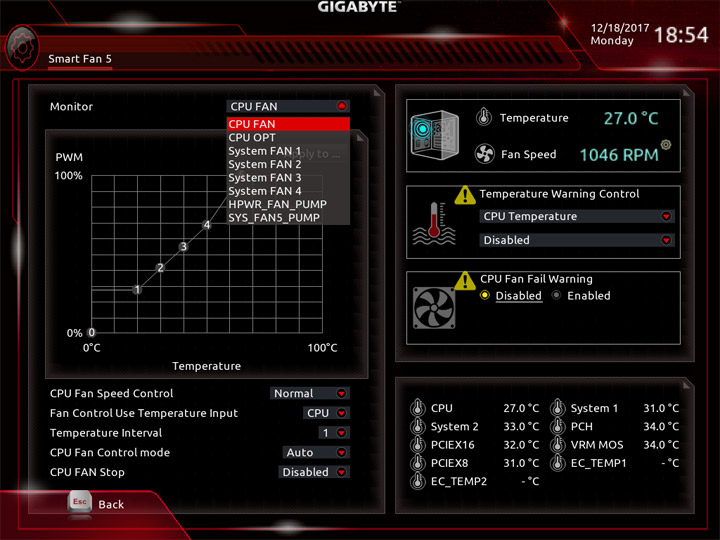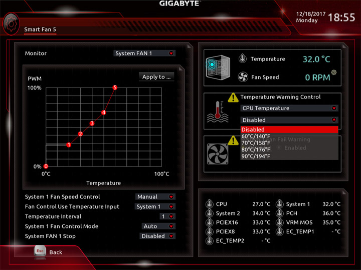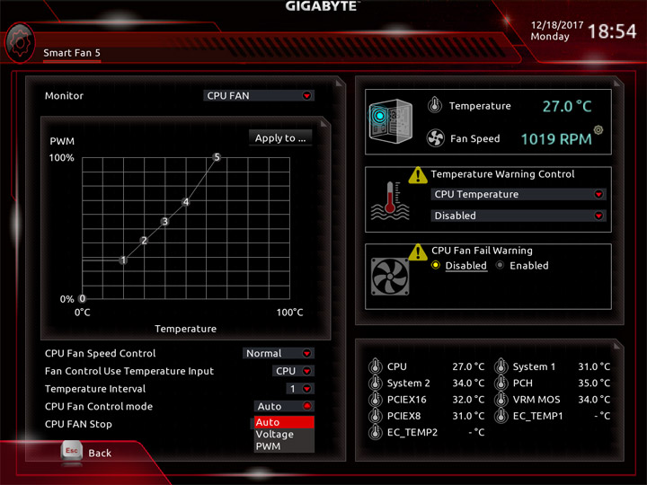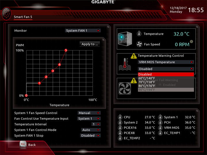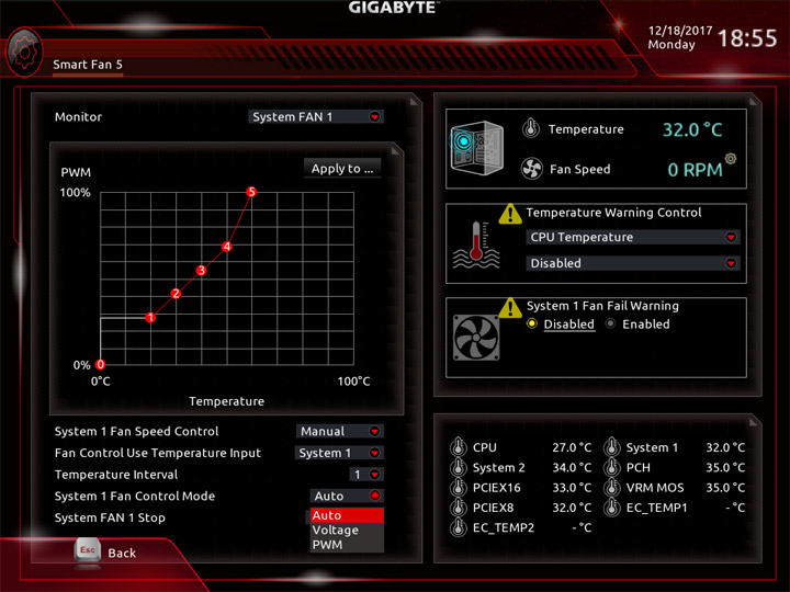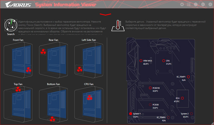 Среда по управлению вентиляторами изменений не претерпела. На плате есть показания от семи датчиков температуры, ещё два могут быть получены посредством подключаемых моделей, они есть в комплекте поставки. Значение температур можно использовать как базовый параметр для алгоритма замедления частоты вращения системных охладителей. На всех колодках допускается выбор способа управления, изначально работает автоматическое определение типа оборудования.