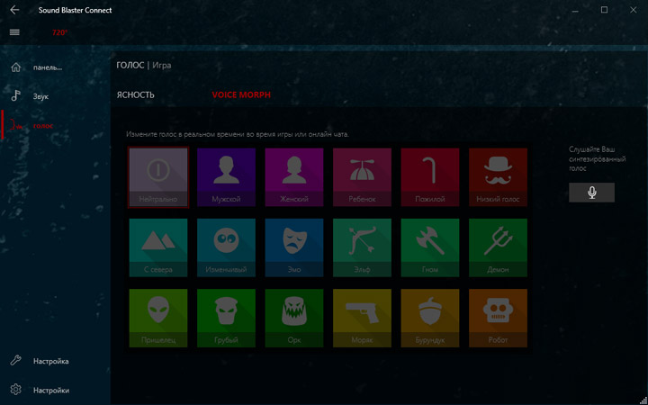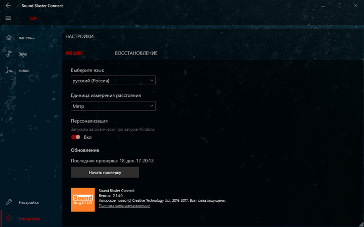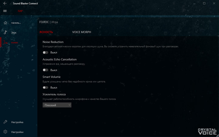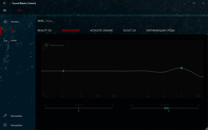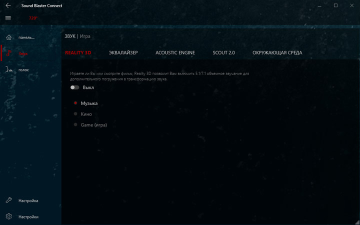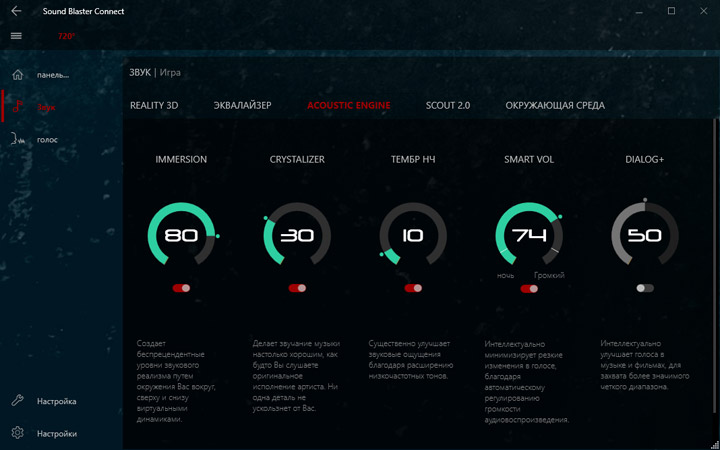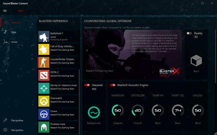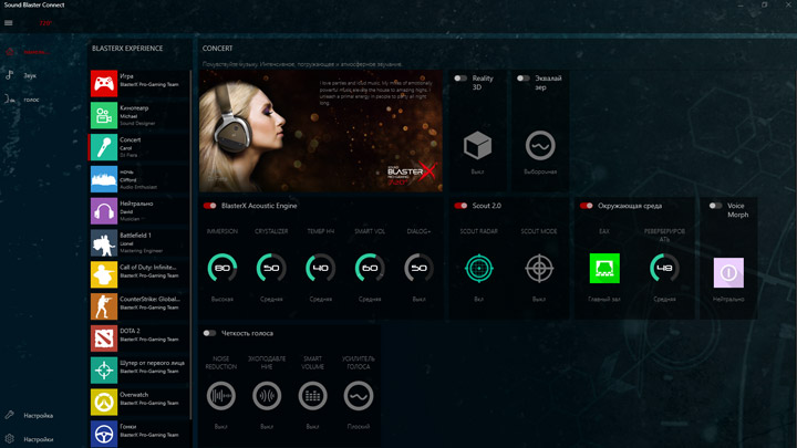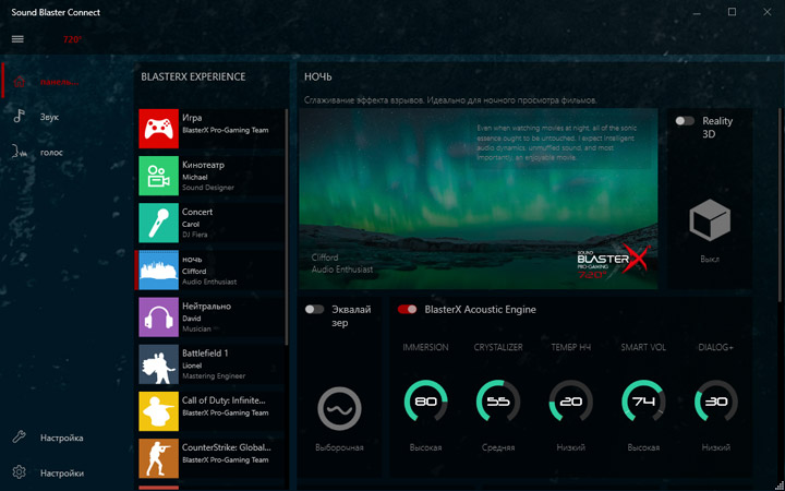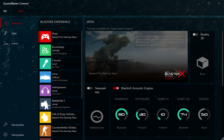 Для преображения звучания предлагается использовать Creative Sound BlasterX 720°. От прошлых продуктов этого разработчика новинка отличается наличием множества готовых профилей не просто под сценарии, а с конкретным стилистическим обозначением. Надо сказать, эффекты действительно в корне меняют общее впечатление о воспроизводимом контенте. Видимо, именно поэтому «чистому» звучанию уделили не слишком много внимания.