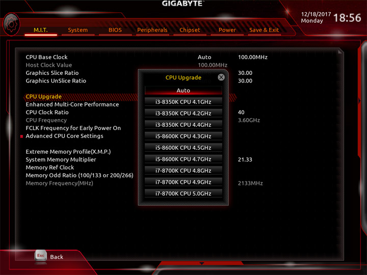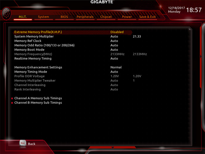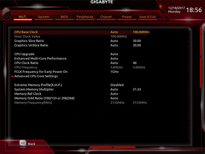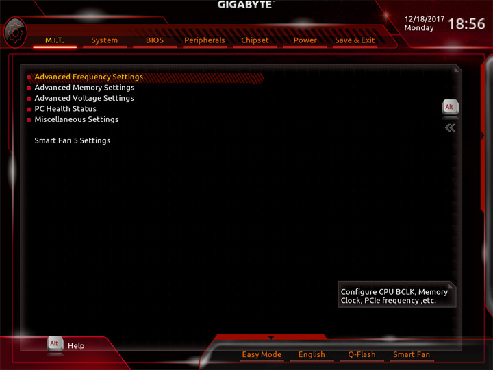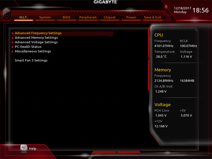 Структура и внешний вид основного режима работы с настройками UEFI ничуть не изменились относительно продуктов прошлого поколения. В первом же разделе, имеющем название M.I.T., собраны все пункты для разгона компьютера. Имеются готовые профили для упрощённого оверклокинга ЦП.