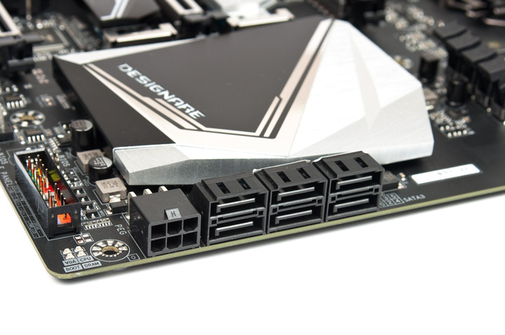 Размеры устройства соответствуют формату ATX, предусмотрено девять отверстий для его крепления в корпусе. Выделяется пара дополнительных гнёзд питания — для процессора (четырёхконтактное) и усиливающее линии PCI-E (на шесть контактов). Рядом с последним распаяна четвёрка красных диагностических светодиодов.