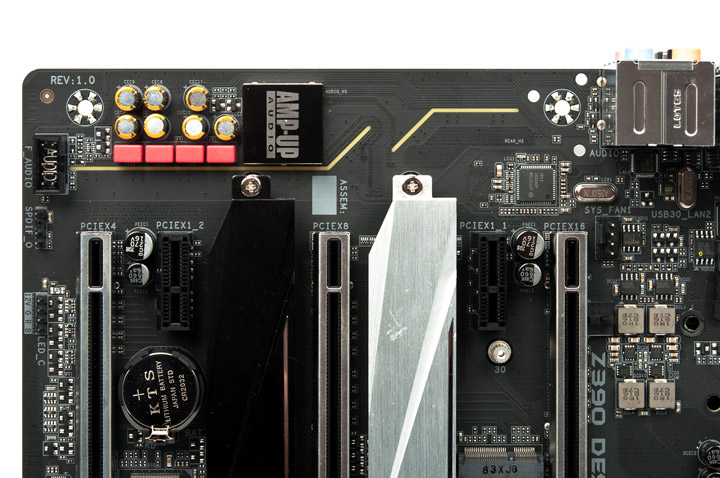 Реализация аудиосоставляющей включает набор особых конденсаторов (двух типов) и экранирования для кодека, которым выступила старшая модель ALC1220 от Realtek. Нет ни ОУ, ни дополнительных микросхем вроде отдельного ЦАП.