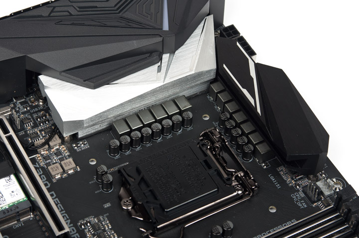 ШИМ-контроллер — семиканальный ISL69138 от Intersil Corporation. Посредством шести удвоителей (ISL6617A) реализована работа двенадцатиканального стабилизатора напряжения процессора, для графической части есть одна «фаза», обходится без внешнего драйвера. В роли силовых элементов привлекли сборки типа DrMOS SiC634 (двенадцать элементов) и SiC620A (одну — для iGPU) производства Vishay Intertechnology. Обязательно изучим поведение этого узла при разгоне ЦП, но уже сразу можно констатировать существенную переработку схемы относительно устройств предыдущих поколений.