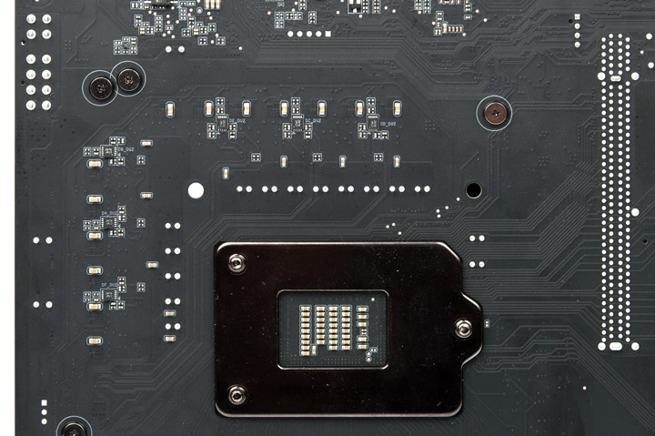 Все навесные конструкции крепятся винтами. В области размещения усилительной платины от СО для ЦП нет ничего «лишнего». Вытравленные участки проводников в слоях платы сопровождаются распайкой светодиодов многоцветного исполнения. Из дополнительных колодок в наличии всего одна, типа RGB.