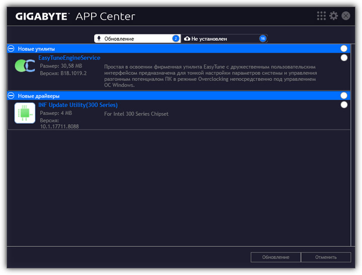 Общая оболочка App Center по-прежнему ответственна за интеграцию и пуск компонентов, поиск обновлений для утилит с драйверами, а также их установку посредством встроенного мастера.