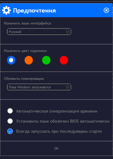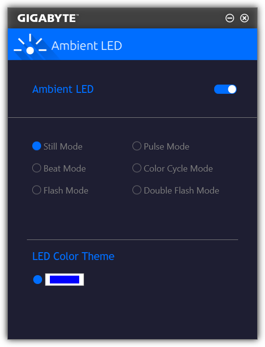 Обособленной RGB Fusion (для работы с подсветкой) нет. Вместо неё заготовили куда более скромный тип ПО — Ambient LED. Есть всего шесть сценариев иллюминации, но оттенок свечения можно выбрать любой. Другие компоненты ПК с подсветкой, по всей видимости, придётся настраивать, используя их собственное ПО, при его наличии конечно же. На первом месте находится кнопка деактивации работы, преследуя интересы всех, кого дополнительные источники света особо беспокоят.