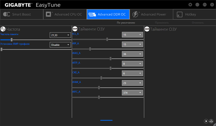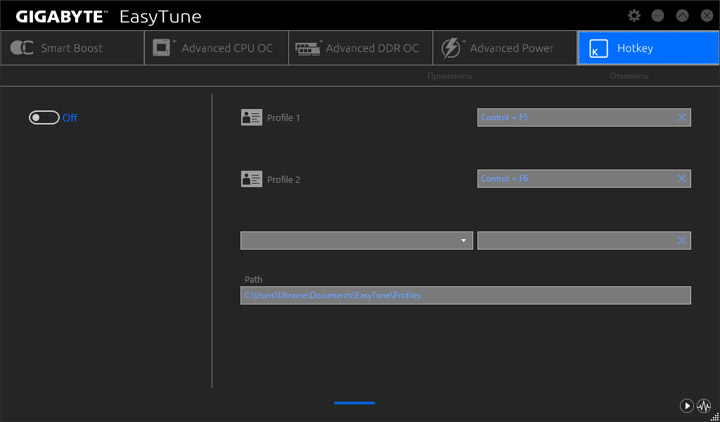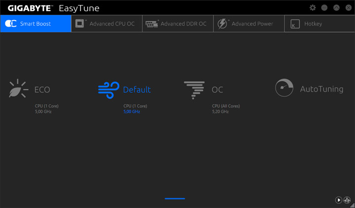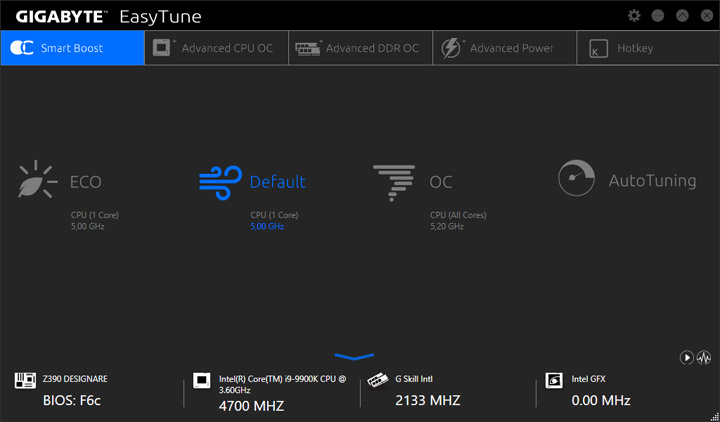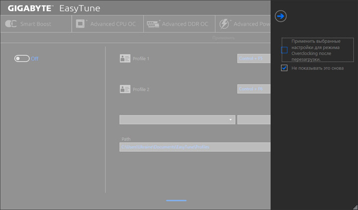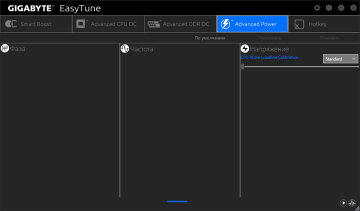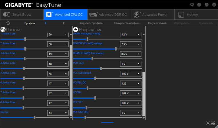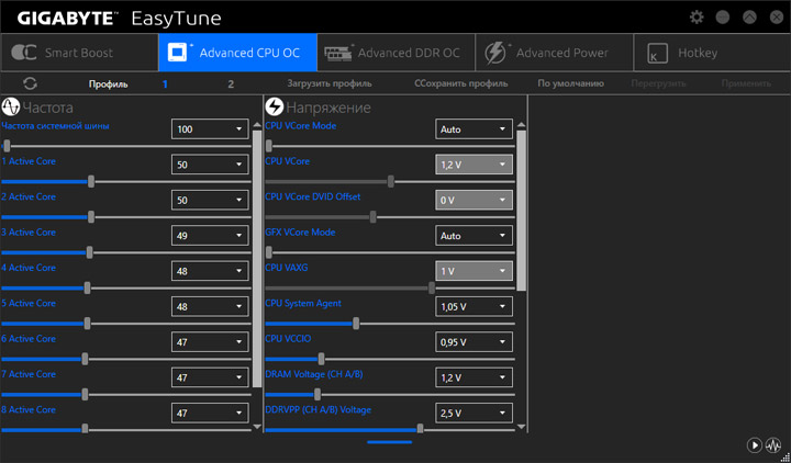 На очереди знакомство с более привычными и полезными приложениями. EasyTune выглядит как и раньше, тут можно получить информацию о системе, но ключевым свойством являются два настраиваемых, согласно собственным пожеланиям, профиля, которые можно активировать «на лету», используя комбинацию горячих клавиш. Напряжения, включая второстепенные, можно менять тут же, проводя эксперименты по разгону, это весьма полезное дополнение.