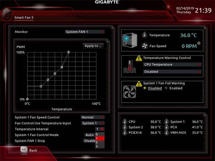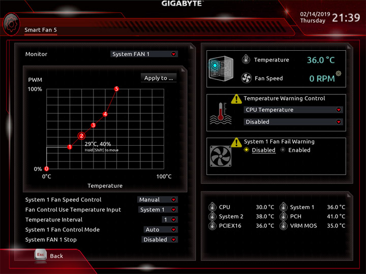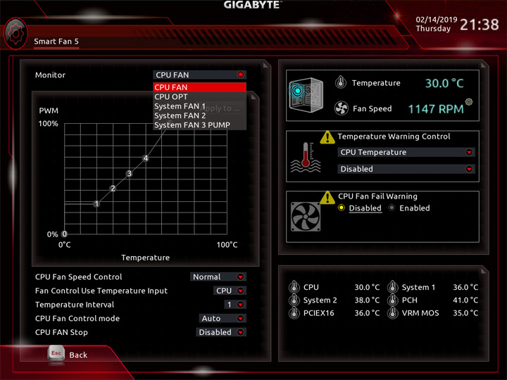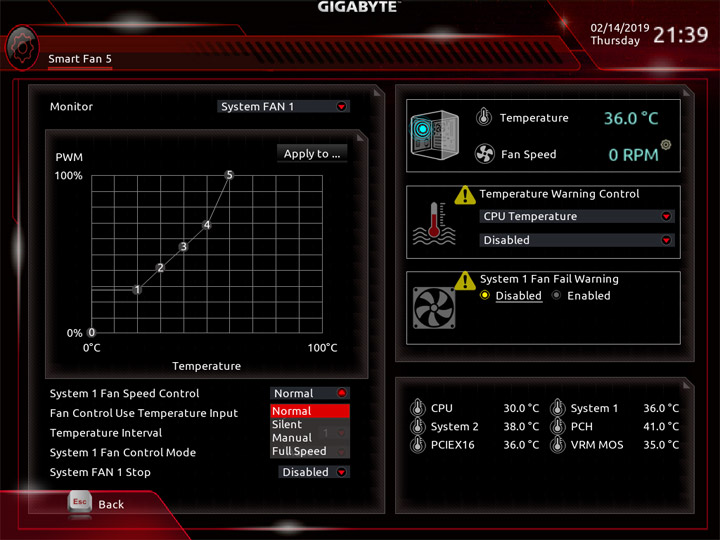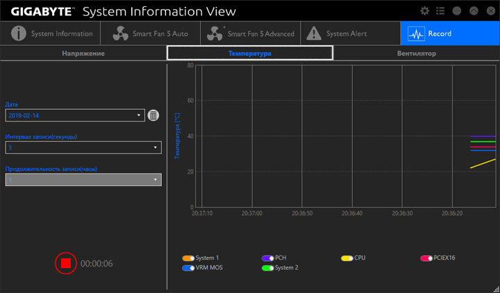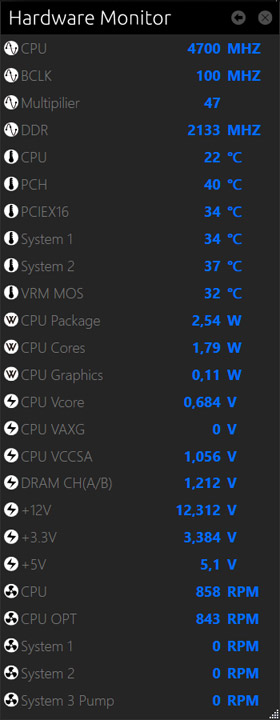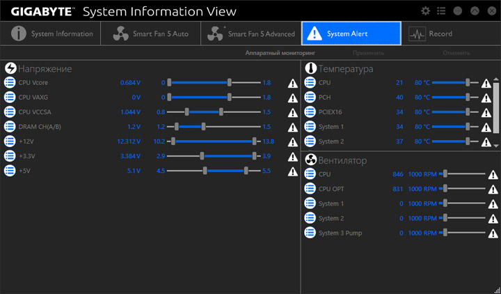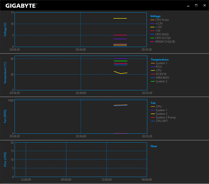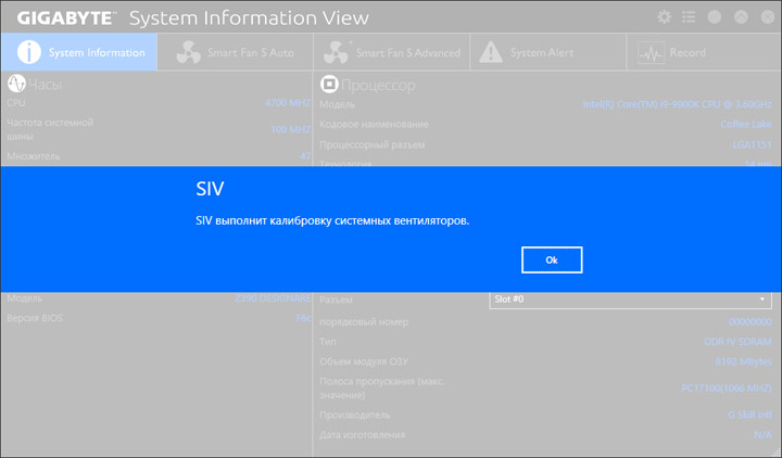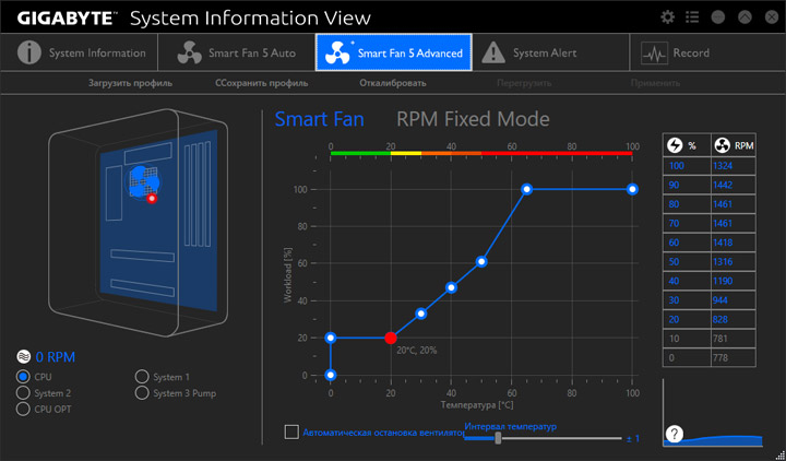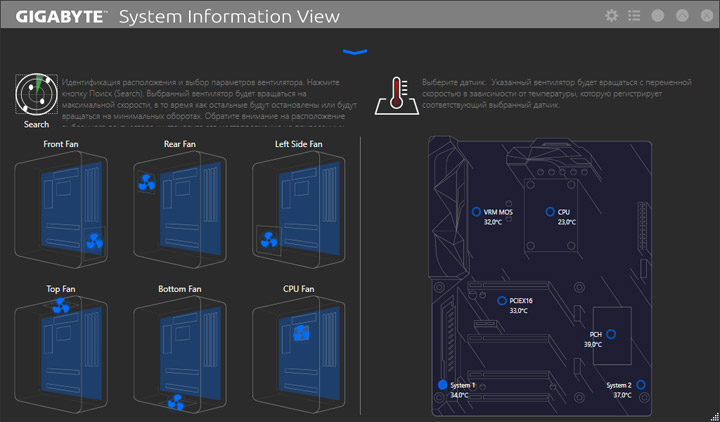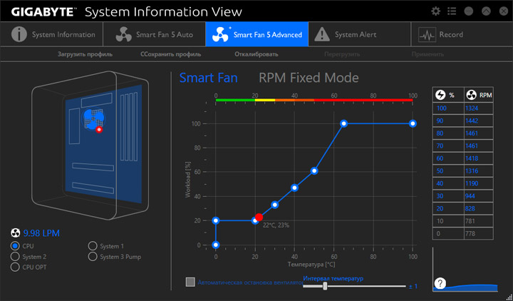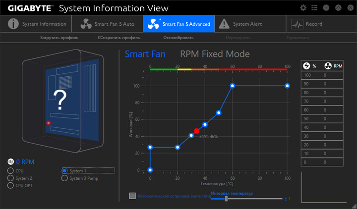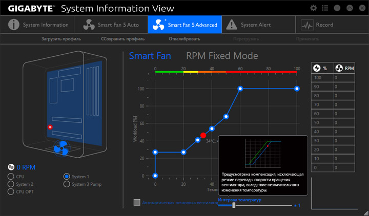 Модуль по контролю за параметрами в режиме реального времени называется SIV. Тут же есть инструмент для наладки работы охладителей с функциями, проработанными глубже, чем в UEFI. Калибровка вентиляторов запускается принудительно, сразу после старта ПО. В результате появляется «паспорт», по которому можно быстрее подобрать желаемый режим функционирования всей системы охлаждения. Окно можно «сжать» до небольшого, там будут отображаться всевозможные системные переменные, включая данные с температурных сенсоров. Имеется проблема с датчиком ЦП, по всей видимости, он внешний, иначе сложно объяснить, почему показания там по значению меньше, чем у окружающей среды.