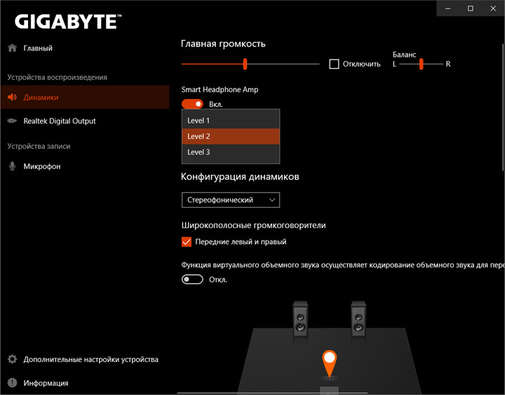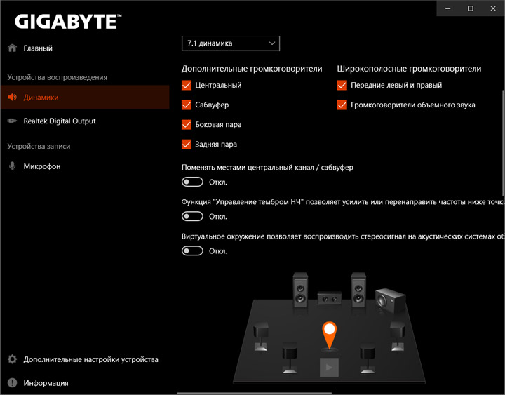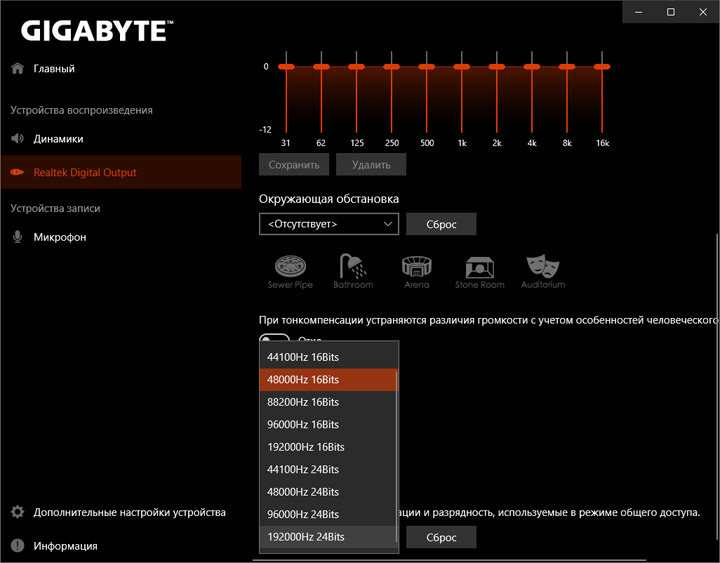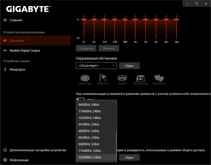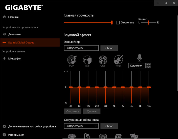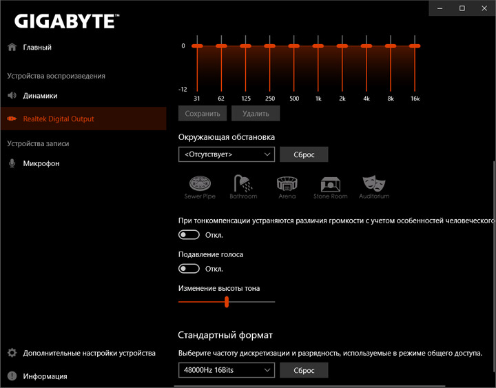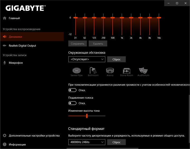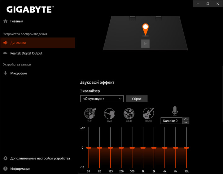 Наладка звучания будет проходить при участии конфигуратора от Realtek, использующего фирменные цвета серии Aorus. Среди специальных функций хочу выделить возможность ручной смены предусиления выходного сигнала для устройства, подключенного к зелёному гнезду на задней панели. Это будет полезно для всех владельцев наушников. Сменить тип подключаемого оборудования (и, тем самым, добиться изменения звуковой картины) не предусматривается. ОУ, ЦАП отсутствуют и это заметно сказывается на восприятии музыкального материала. Тут решили уделить больше внимания диапазону «мидбаса», сделав его упругим и «мясистым», но, тем самым, сфера ВЧ оказалась очень сильно оттенённой, даже в СЧ уверенным был лишь вокал, а другие инструменты звучали менее ярко, чем следовало бы. Придать нужный характер любимым композициям можно посредством эквалайзера.