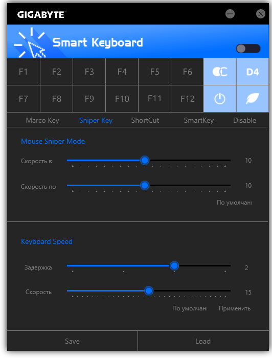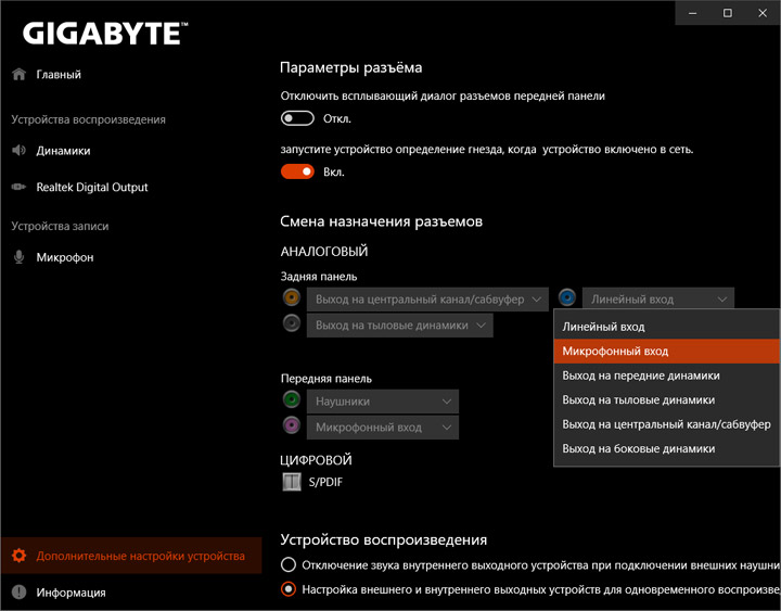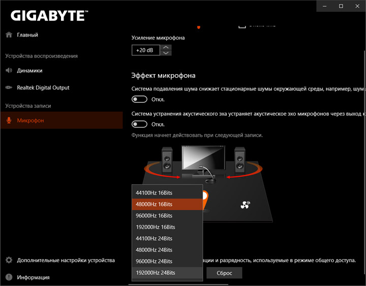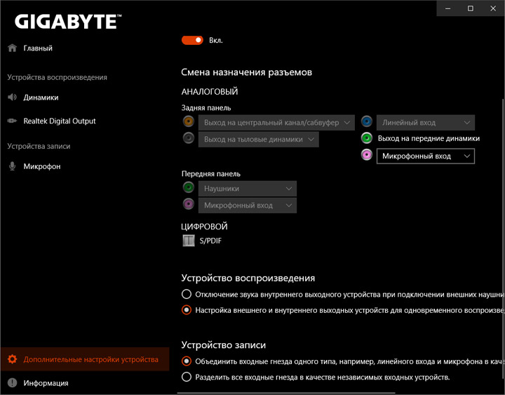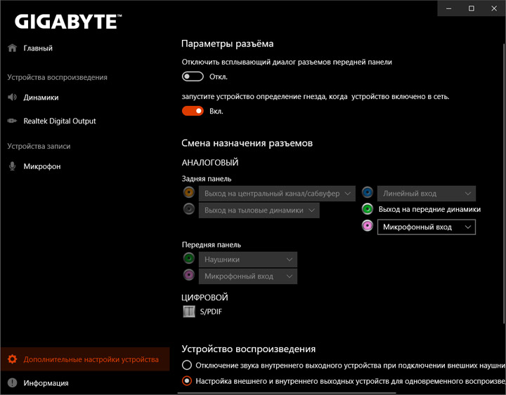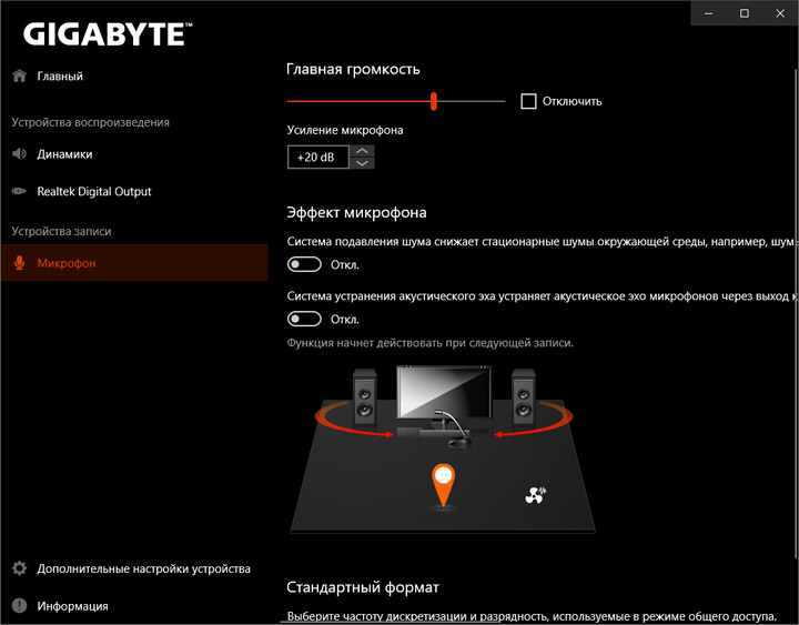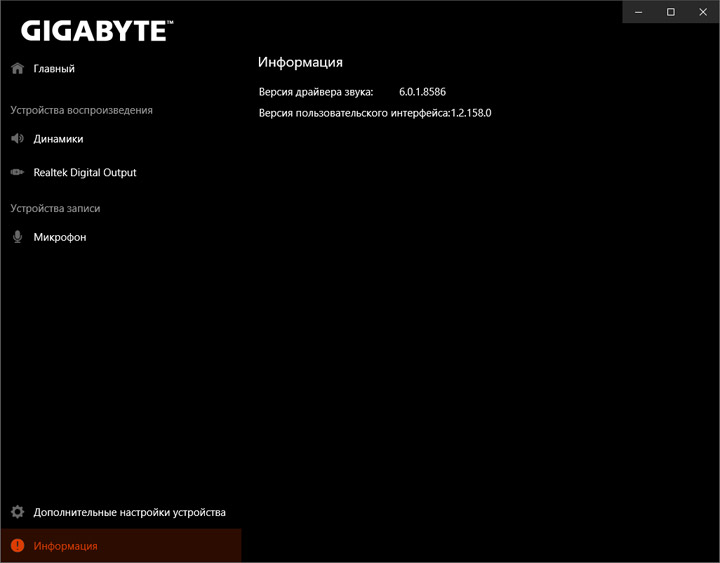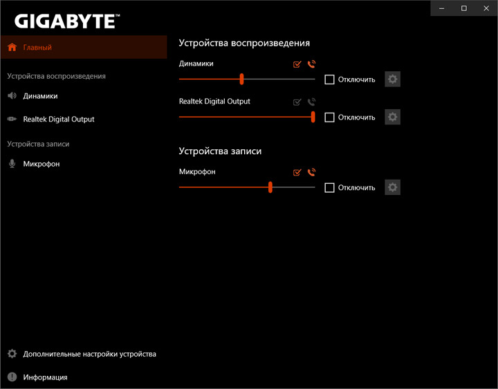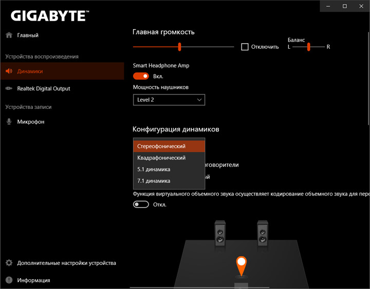 Наладка звучания будет проходить при участии конфигуратора от Realtek, использующего фирменные цвета серии Aorus. Среди специальных функций хочу выделить возможность ручной смены предусиления выходного сигнала для устройства, подключенного к зелёному гнезду на задней панели. Это будет полезно для всех владельцев наушников. Сменить тип подключаемого оборудования (и, тем самым, добиться изменения звуковой картины) не предусматривается. ОУ, ЦАП отсутствуют и это заметно сказывается на восприятии музыкального материала. Тут решили уделить больше внимания диапазону «мидбаса», сделав его упругим и «мясистым», но, тем самым, сфера ВЧ оказалась очень сильно оттенённой, даже в СЧ уверенным был лишь вокал, а другие инструменты звучали менее ярко, чем следовало бы. Придать нужный характер любимым композициям можно посредством эквалайзера.