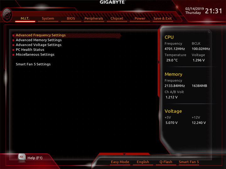 Общая структура расширенного меню не меняется уже долгие годы. Заглавный пункт — M.I.T. — предлагает рубрики для проведения разгона системы. Я не увидел никакого механизма по упрощённому оверклокингу, кроме активации XMP. С другой стороны, наполнение пунктами меню полное, в проведении мероприятий собственными силами ничего помешать не должно.