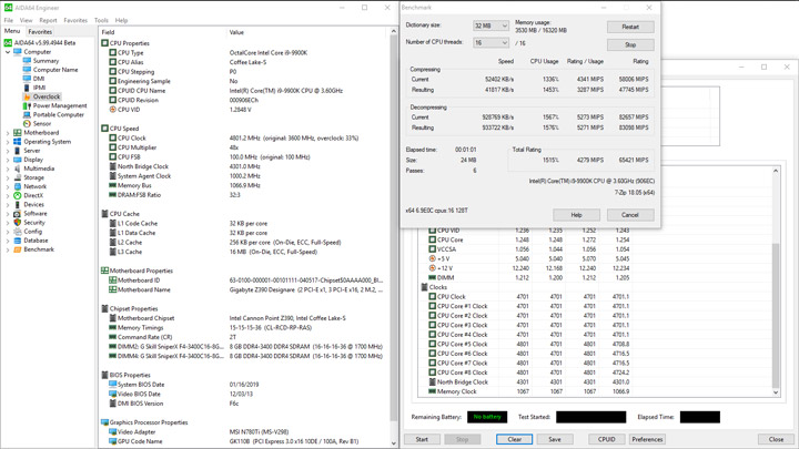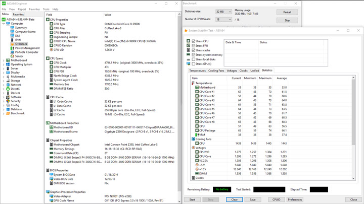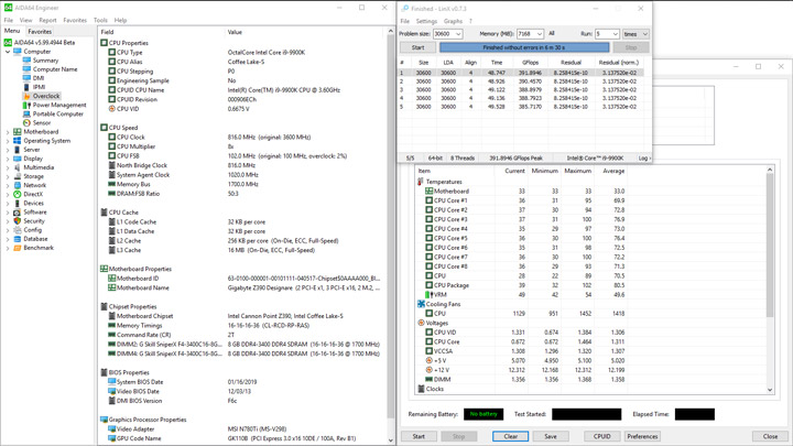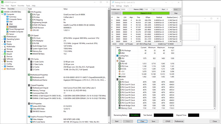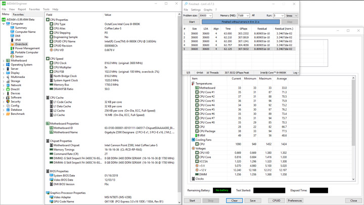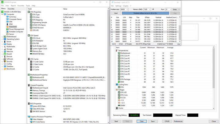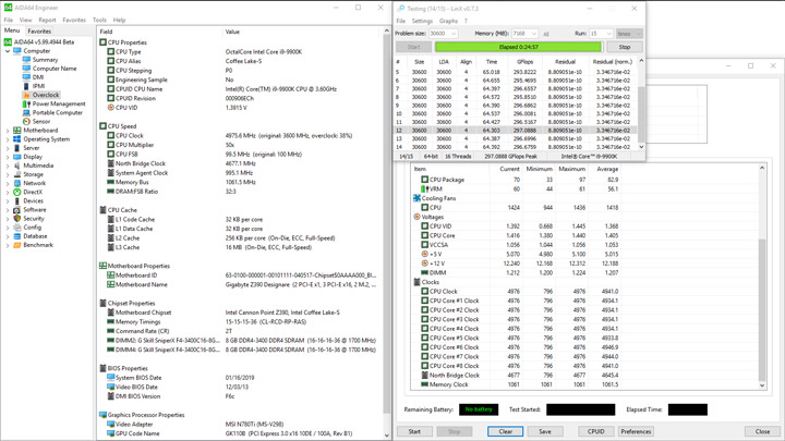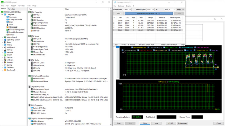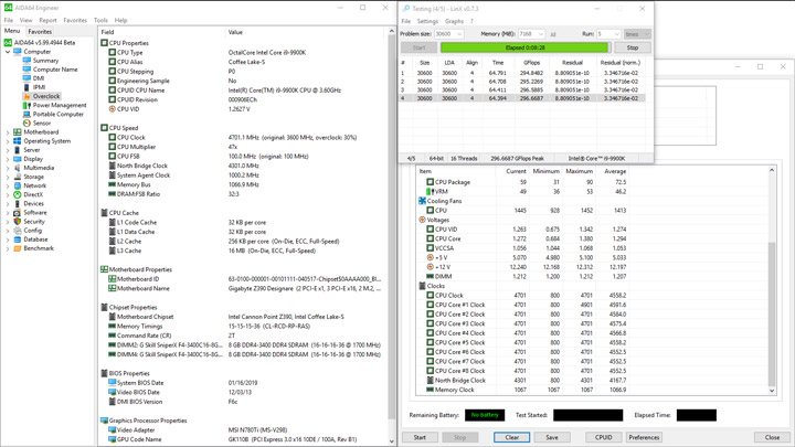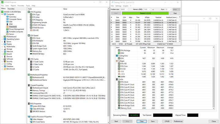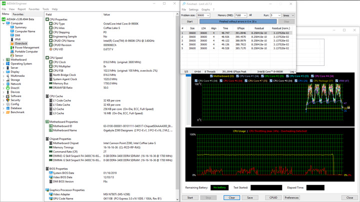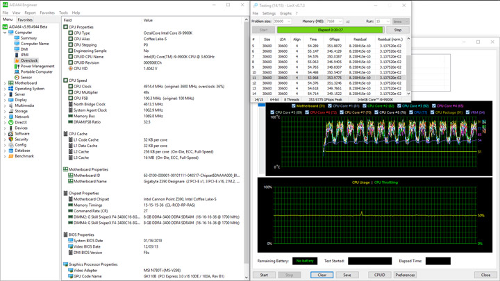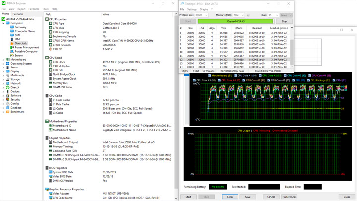 Ускоренный режим работы ПК не привёл к проблемам, все тесты завершились безошибочно. Прогрев ЦП в LinX с шестнадцатью потоками оказался в допустимых рамках, а вот восемь штук привели к активации троттлинга. С небольшим округлением, частоты выросли на 100 МГц и составили 4,8–5,1 ГГц.