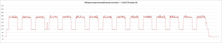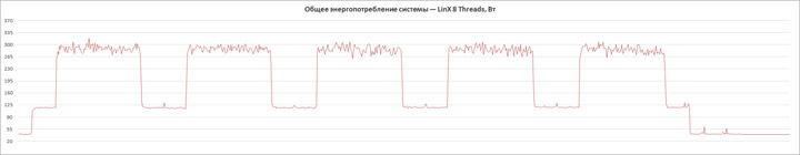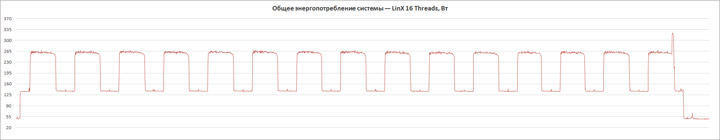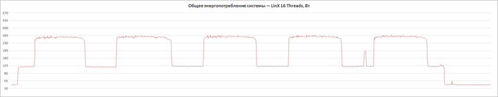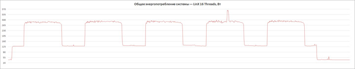 Из-за перегрева в последнем сценарии и активации защитных технологий истинной картины потребления мы не увидим, и всё же цифры по замерам вышли такими: режим простоя — 39 Вт, 299 Вт (без учёта всплеска) — уровень для 16-ти потоков, 319 Вт — пик для использования восьми штук в сценариях LinX.
