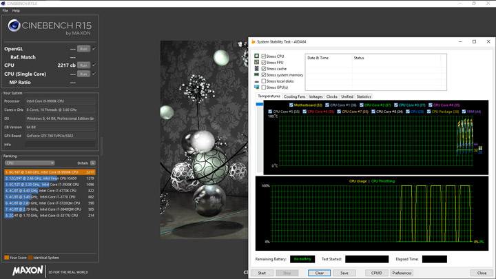 На границе перегрева функционировал Core i9-9900K в сценарии LinX с восемью тестовыми потоками, но до троттлинга дело не дошло. Нижняя отметка потребления стендом равнялась 36 Вт, а верхние — 268 и 273 Вт.