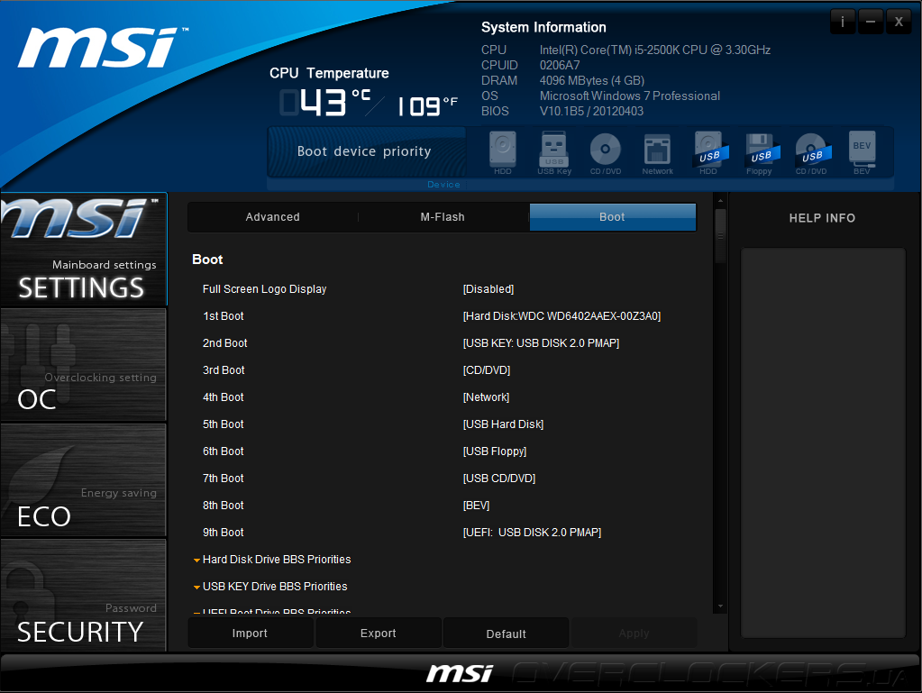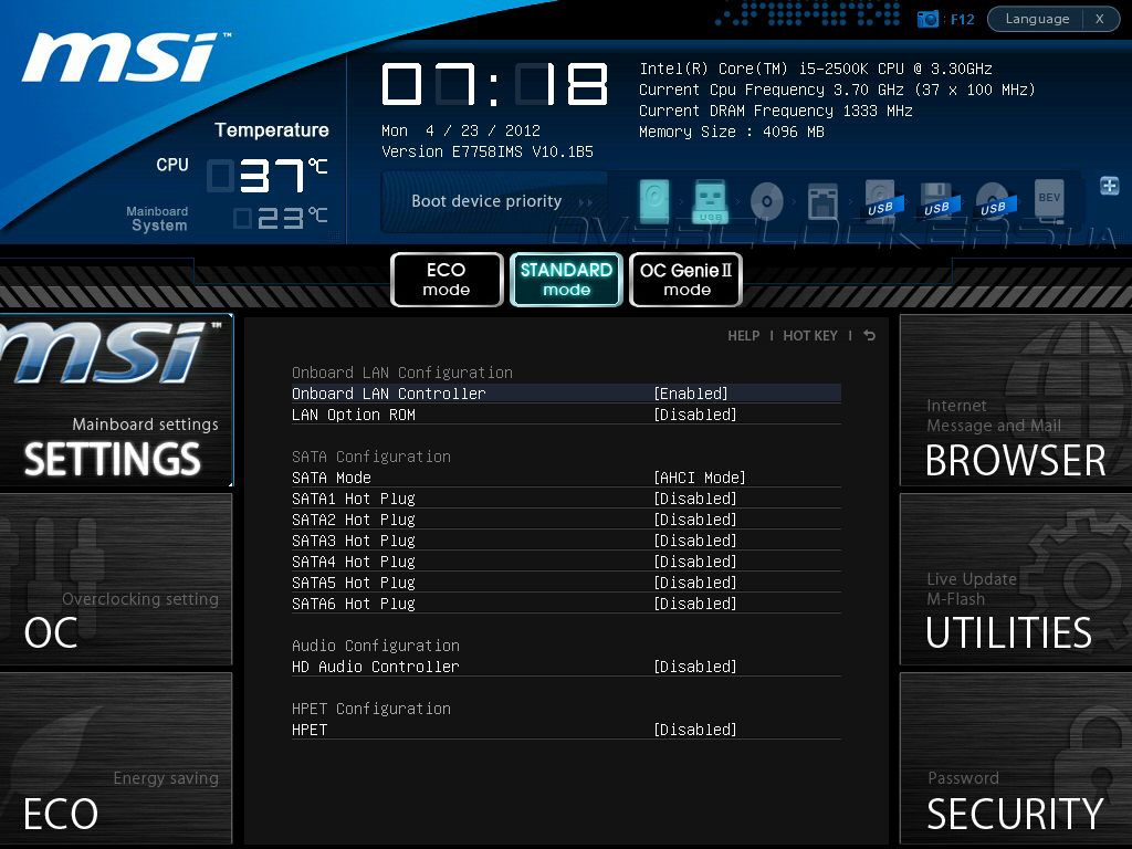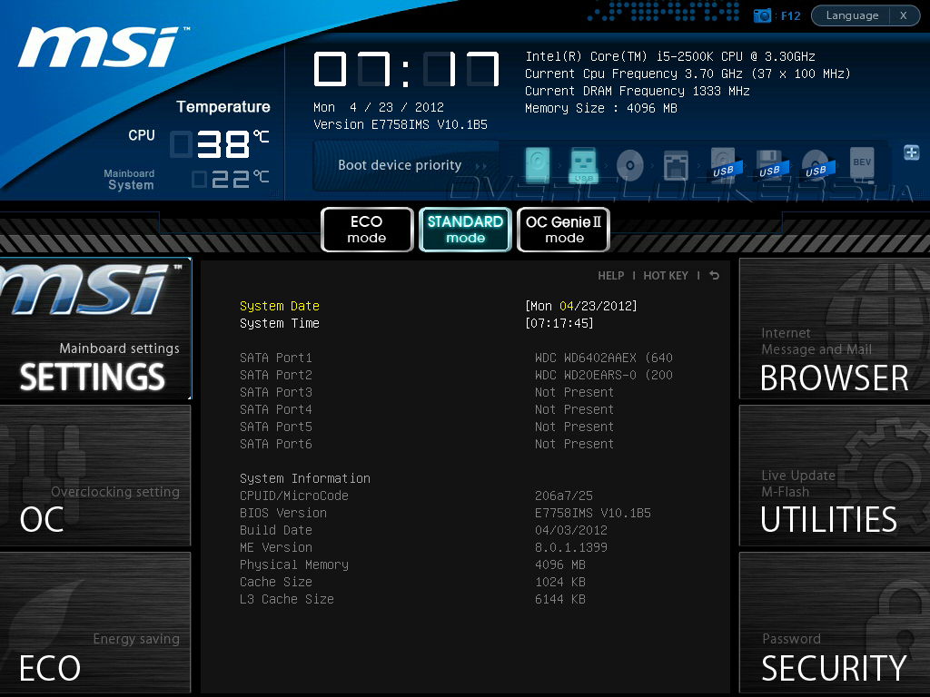 Помимо этого, в главном меню присутствуют показания двух температурных датчиков, отображаются системные дата и время, версия прошивки и краткая спецификация установленных компонентов. Интересно выглядит выбор порядка загрузочных устройств, для установки достаточно переместить пиктограмму соответствующего накопителя в нужное место. Кроме того, присутствует возможность изменения языка отображения меню, а клавиша «F12» позволяет сохранять снимки экрана.
