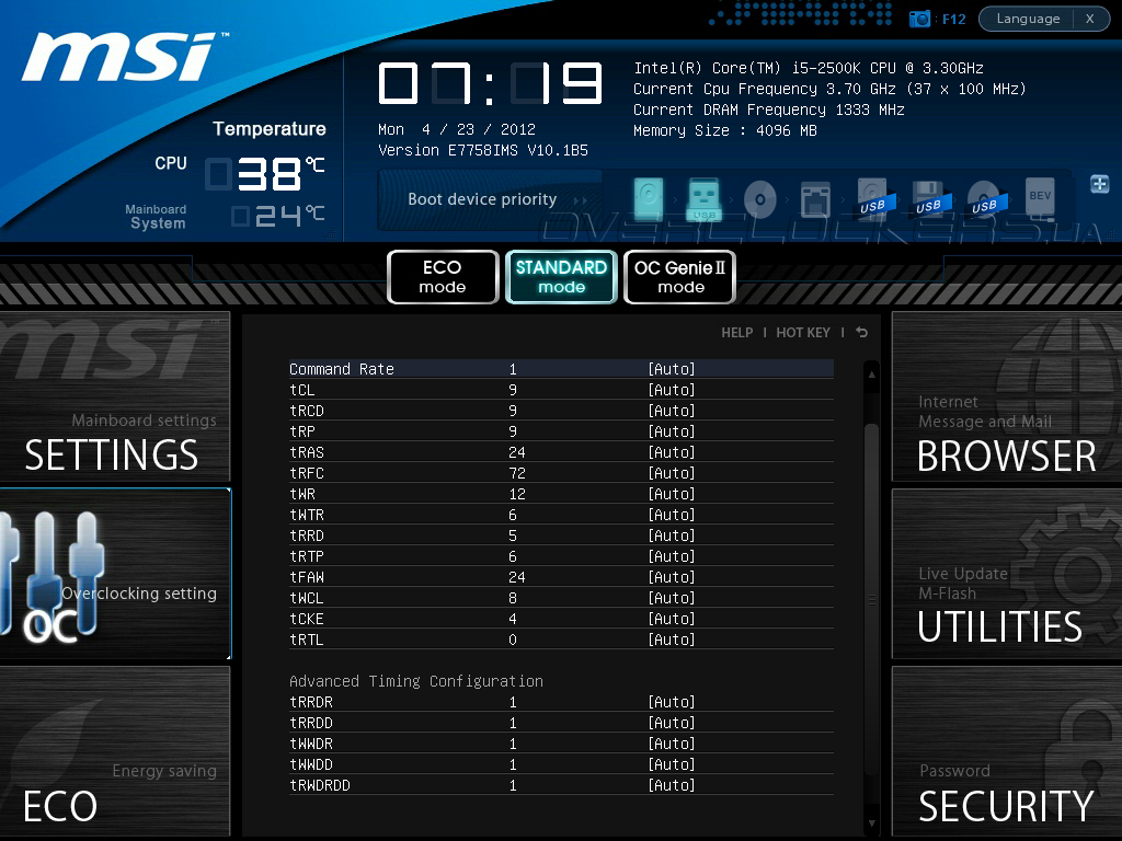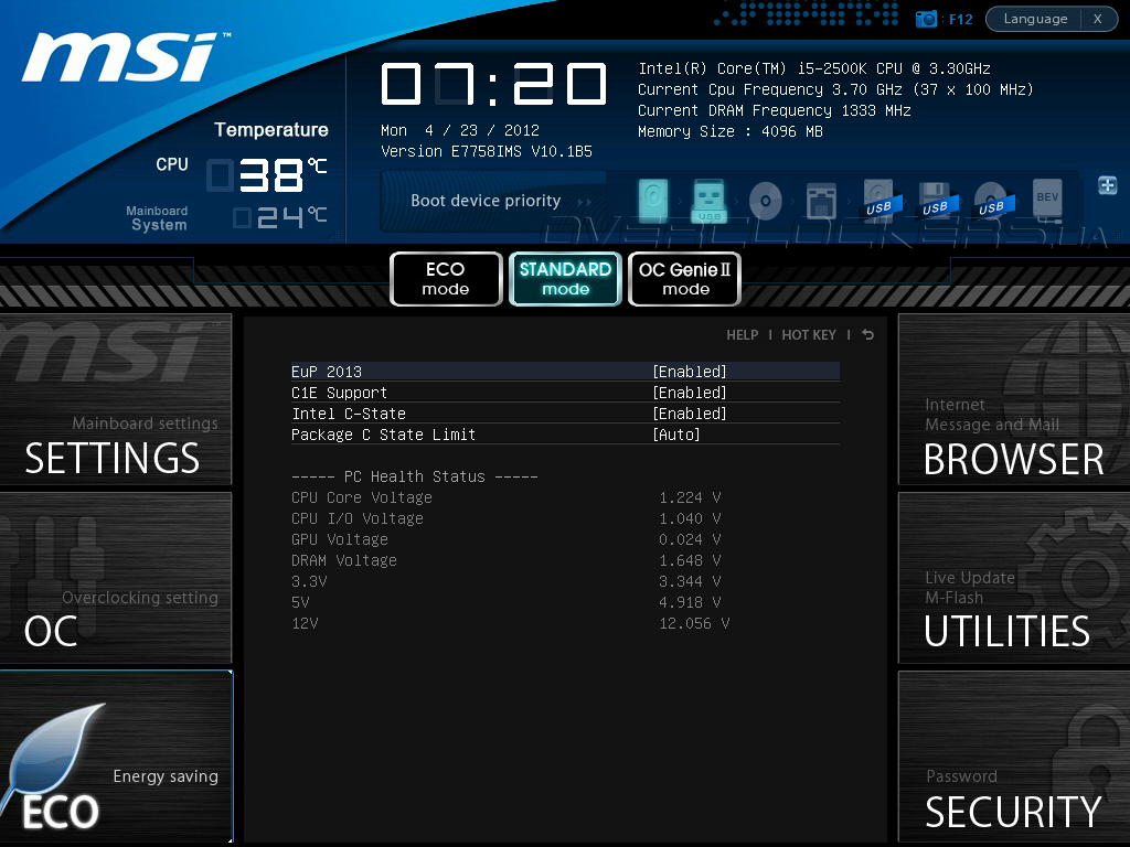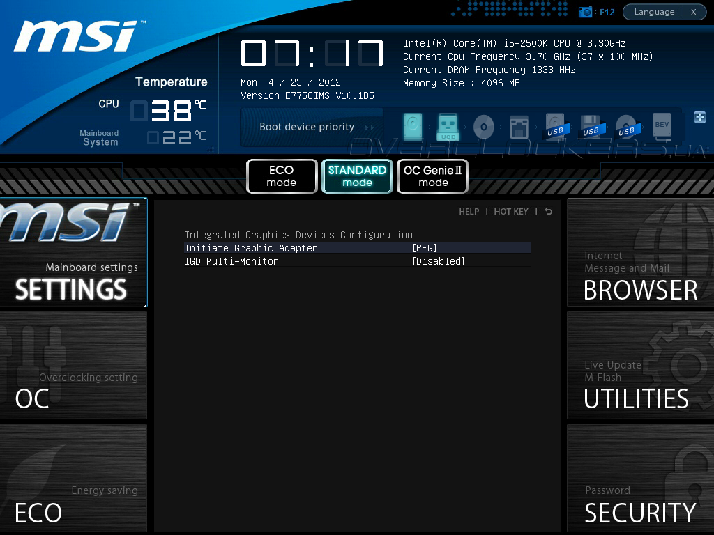 После входа в меню настроек пользователя встречает главный экран, который позволяет выбрать один из режимов работы прошивки: ECO mode, STANDARD mode и OC Genie II mode. Первый из режимов включает встроенные функции энергосбережения, второй предназначен для ручной настройки параметров системы, ну а третий должен активировать функцию автоматического разгона OC Genie II. На деле, с разгоном у MSI B75A-G43 совершенно не сложилось, так что этот режим оказался следствием унификации прошивки.
