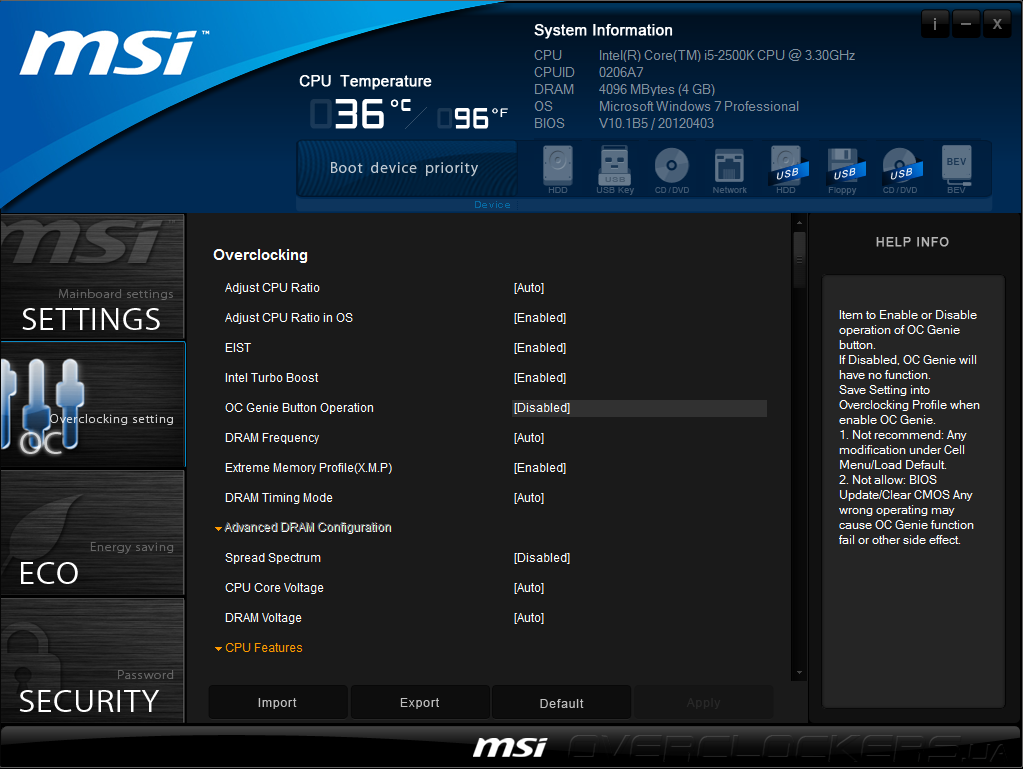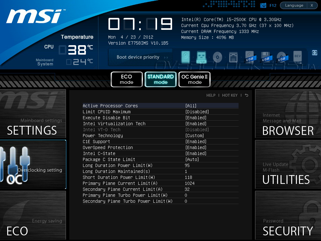 Все настройки, связанные с оптимизацией производительности находятся в меню OC Overclocking Settings. Несмотря на отсутствие возможности увеличения множителя для процессоров Intel серии «К», прошивка MSI B75A-G43 предлагает некоторые настройки разгона. Например, существует возможность управления коэффициентом умножения процессорных ядер, но только в пределах, установленных технологией Turbo Boost. Также доступен выбор частоты ОЗУ, для нашего Core i5-2500K набор множителей состоял лишь из двух значения — 1066 МГц и 1333 МГц. Есть информация, что с установкой 22-нм Intel Ivy Bridge ситуация меняется и максимальная частота модулей ОЗУ увеличивается до 2200 МГц.