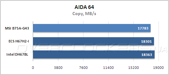 По части пропускной оперативной памяти материнскую плату MSI B75A-G43 нельзя назвать фаворитом, обе соперницы показали лучшие результаты в тесте копирования, а при записи и чтении данных все три участницы обеспечили схожи уровень быстродействия.