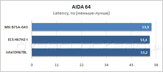 Новинка продемонстрировала наибольшие задержки доступа к ОЗУ, что никак не способствует повышению производительности. Впрочем, не стоит забывать, что MSI B75A-G43 вышла всего месяц назад, так что её прошивка может быть далекой от идеала, и с выходом новых версий UEFI Setup уровень быстродействия может быть увеличен.