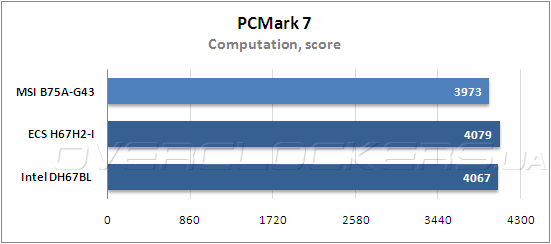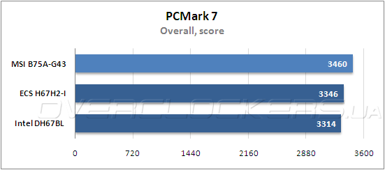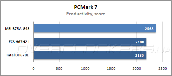 Победу MSI B75A-G43 над конкурентами в Futuremark PCMark 7 обеспечило преимущество в подтесте Productivity, в то время как в остальных сценариях соперницы показали похожие результаты. Очевидно, что в производительности новинки должно хватить для комфортного выполнения повседневных задач.