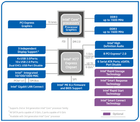 Набор системной логики совместим с любыми процессорами в исполнении LGA1155, поддерживаются как новейшие Intel Ivy Bridge, так и 32-нм модели. Для связи с процессором используется комбинация шин DMI 2.0 и FDI. Первая отвечает за обмен данными, а вторая — за передачу изображения от встроенного видеоядра. В сравнении с моделями предыдущего поколения расширились возможности дисковой подсистемы. Добавились функции Rapid Start, которая позволяет сократить время загрузки операционной системы для конфигураций, оборудованных быстрыми SSD-накопителями, и Smart Connect. Работа последней заключается в получении последних обновлений информации из социальных сетей и сервисов мгновенных сообщений даже при выключении операционной системы. Кроме того, Intel H77 Express поддерживает до четырех портов высокоскоростной последовательной шины USB 3.0. В остальном, функциональность новинки практически не отличается от Intel H67 Express. Набор системной логики располагает восемью линиями PCI Express 2.0, пользователям доступны шесть портов SATA, два из которых поддерживают скорость 6 Гбит/с, а еще четыре способны работать в режиме 3 Гбит/с.