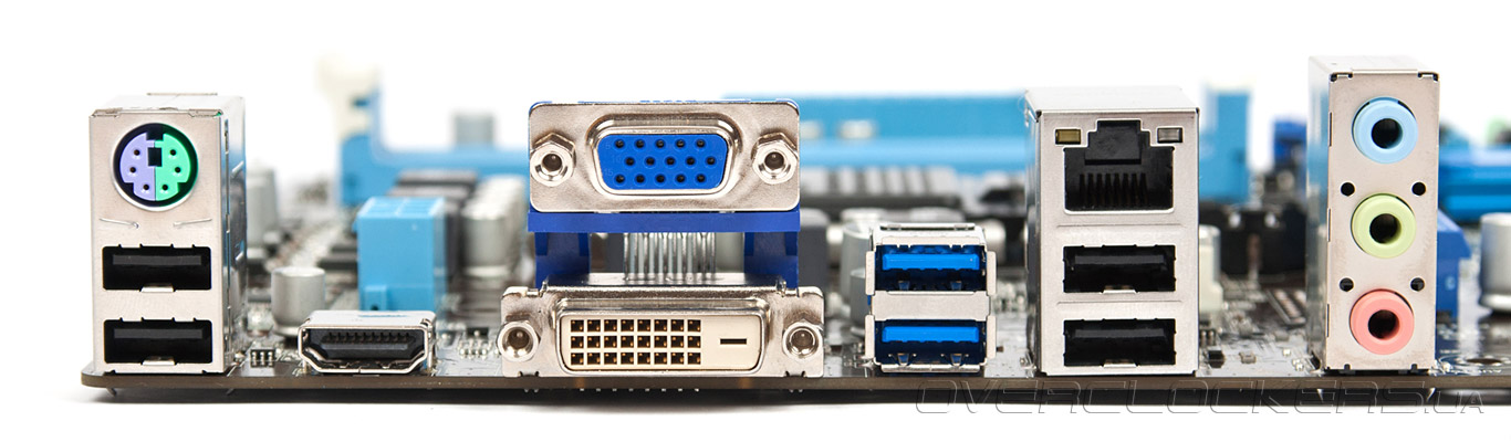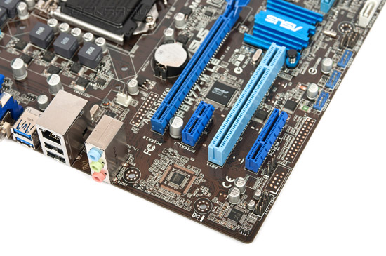 Для установки внешнего графического адаптера предназначен единственный слот PCI Express 3.0 x16. Такой режим возможен только при использовании новейших 22-нм процессоров, а с Intel Sandy Bridge разъем работает как PCI-E 2.0. Дополнительные платы расширения можно установит в слоты PCI-E 2.0 х1 и PCI-E 2.0 х4. Последний способен принять даже второй игровой акселератор, для этого в задней стенке разъема сделан специальный вырез. Мы не будем судить о производительности получившейся связки AMD CrossFireX и её целесообразности, но сама возможность создания такой конфигурации вызывает уважение. Кроме того, материнская плата оснащена одним слотом PCI, работа которого обеспечивается микросхемой ASMedia ASM1083.