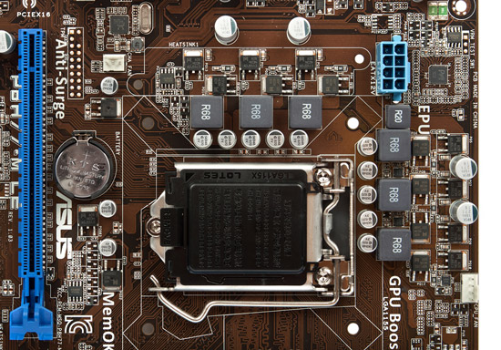 Следуя давней традиции, ASUS переименовал микросхему, отчего истинного производителя ШИМ-контроллера определить практически невозможно. Тем не менее, известно, что контроллер поддерживает Load-line calibration и динамическое управление количеством питающих фаз в зависимости от нагрузки, а также позволяет изменять частоту переключения силовых элементов. Все эти функции могли бы пригодиться в разгоне, но, увы, чипсет не предлагает такой возможности. Именно поэтому можно простить отсутствие радиаторов на силовых элементах VRM, которым в штатном режиме работы процессоров достаточно естественного охлаждения.