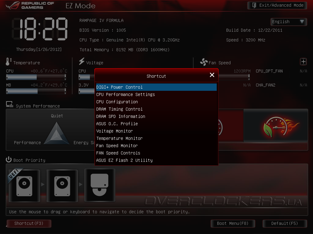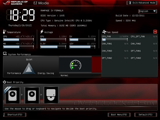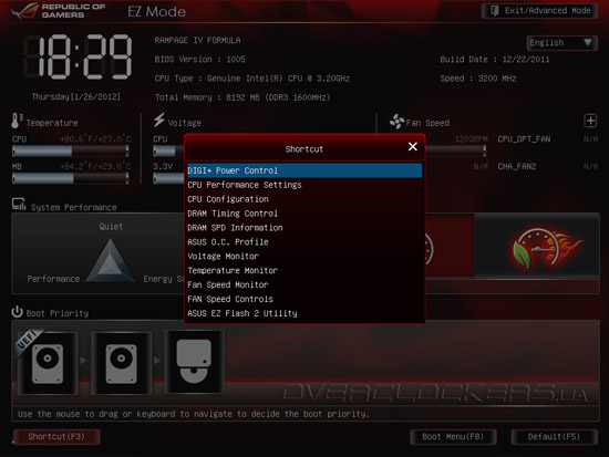 По нажатию клавиши Del на клавиатуре во время загрузки компьютера, пользователь попадает в оболочку UEFI EZ-Mode. Здесь можно установить последовательность устройств, с которых будет загружаться операционная система, выбрать режим работы подключённых к системной плате вентиляторов, быстро настроить энергосберегающие технологии, а также следить за показателями мониторинга основных напряжений и температур.