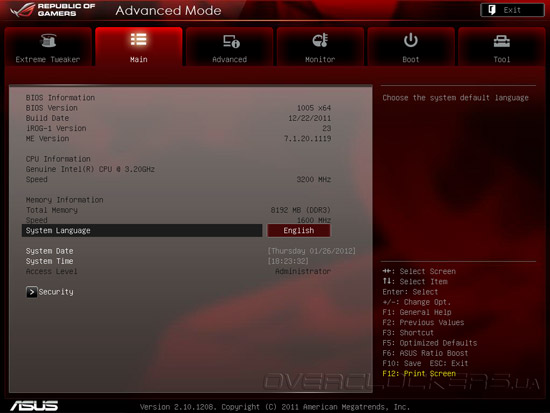 В рассматриваемой версии прошивки второй является вкладка Main, в которой собрана основная информация о системе, включая время и дату, версию прошивки, информацию об установленном процессоре и оперативной памяти.