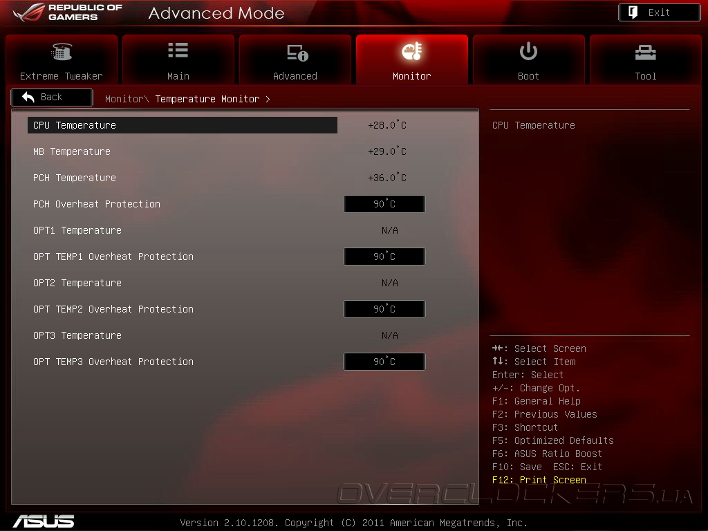 Функциональные элементы платы, призванные упростить задачу профессиональных оверклокеров и любителей разгона расположены в правой верхней части печатной платы около 24-контактоного силового разъёма. Здесь мы обнаружили кнопки Power и Reset, четыре микропереключателя для ручной деактивации PEG слотов, точки замера напряжения питания основных узлов системной платы и процессора с помощью мультимера (ProbeIt Measurement Point), а также POST-индикатор и ряд светодиодов. Для достижения максимальных результатов при использовании жидкого азота, экстремальным энтузиастам должен пригодиться джампер LN2, позволяющий снизить стандартные пороги для срабатывания защит coldbug и coldboot. Переключатель Slow Mode в свою очередь будет полезен, когда в процессе бенч-сессии есть необходимость загрузить ОС на пониженных частотах CPU и RAM, а после — восстановить высокую рабочую частоту для прохождения тестов. Наконец осталось отметить наличие клавиши GO Button, которая предназначена для инициализации функции MemOK! (при нажатии до загрузки системы), а также для активации заранее созданного профиля разгона в среде операционной системы.