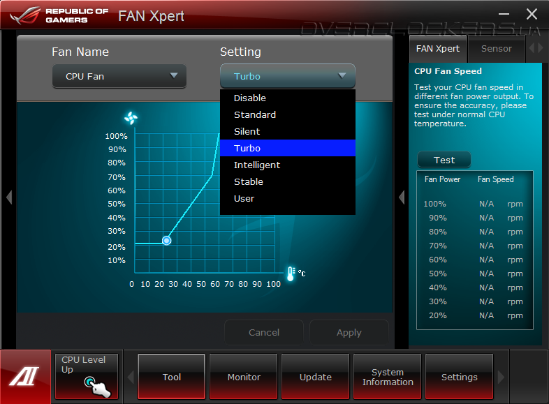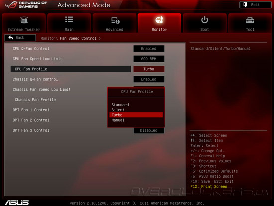 Раздел Monitor позволяет не только осуществлять мониторинг системных температур и напряжений на основных компонентах, а также линиях 3,3 В, 5 В, 12 В, но и управлять подключенными к плате вентиляторами. «Вертушкам» можно вручную задать скорость вращения, активировать один из трёх режимов (Turbo, Standard, Silent) или же задать зависимость скорости вращения от температуры того или иного термодатчика.