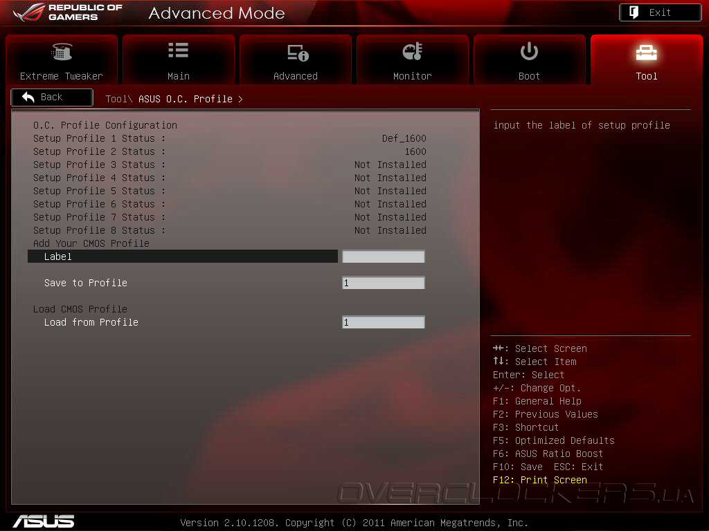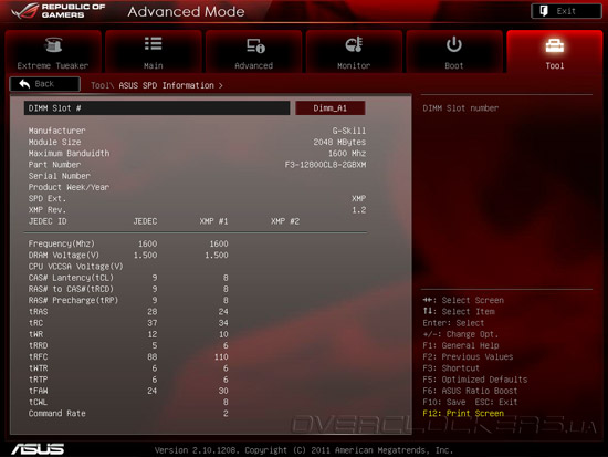 Последний раздел UEFI под названием Tool включает в себя функцию деактивации подсветки дорожек разводки встроенного аудиокодека, утилиту для обновления микрокода платы ASUS EZ Flash 2 Utility, «обнаружитель» установленных модулей ОЗУ, а также меню с оверклокерскими профилями (до 8-ми) и вкладки настройки клавиши Go Button и резервной микросхемы с прошивкой.