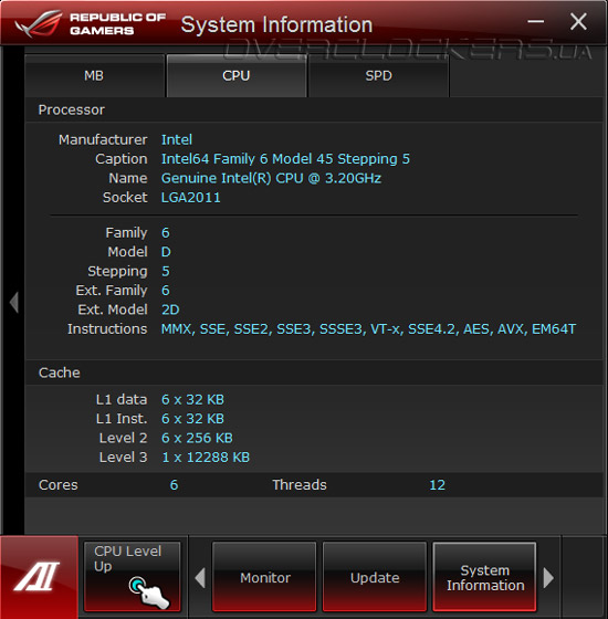 Наиболее интересной и функциональной программой из этого набора является ASUS Ai Suite II, которая была переработана специально для плат семейства Republic of Gamers. Эта утилита позволяет не только осуществлять разгон CPU, не выходя из операционной системы, но и управлять подключенными к материнской плате вентиляторами, системами энергосбережения, а также осуществлять мониторинг температур и напряжений питания основных узлов системной платы.