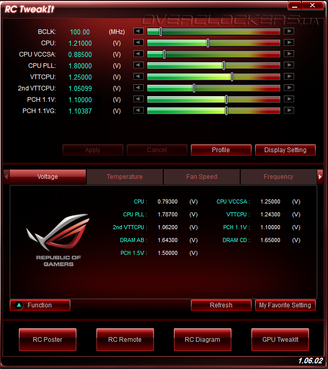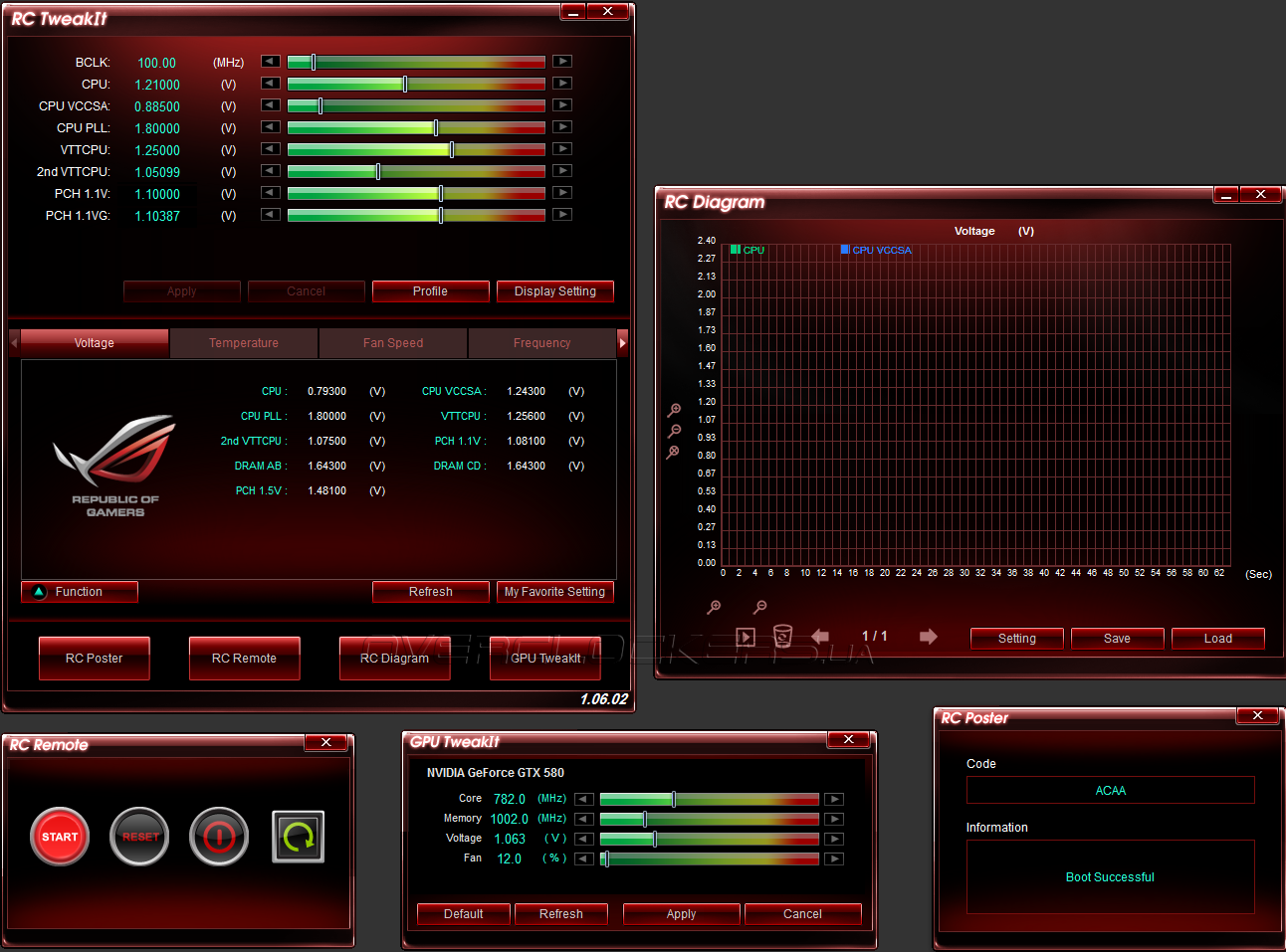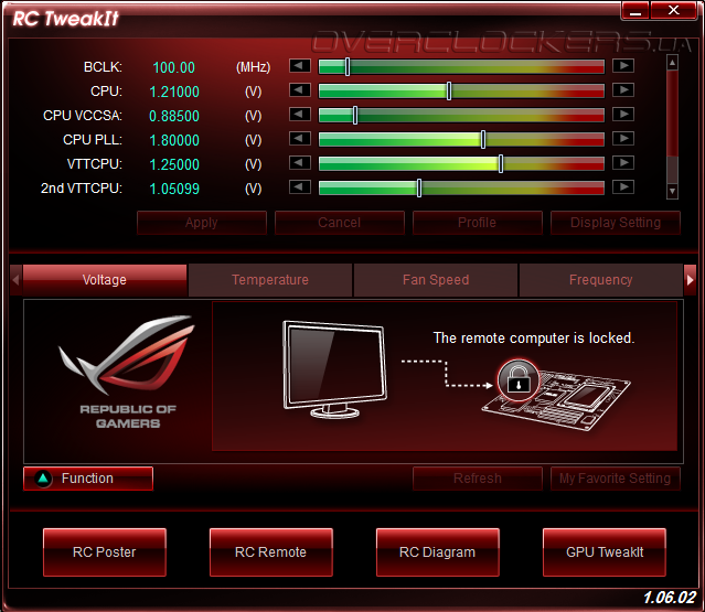 Более того, программа позволяет дистанционно включать и перезагружать систему, сбрасывать настройки CMOS, наблюдать за значениями основных напряжений в режиме реального времени, управлять скоростью вращения подключенных к плате вентиляторов, а также осуществлять разгон графических адаптеров, установленных на ASUS Rampage IV Formula.
