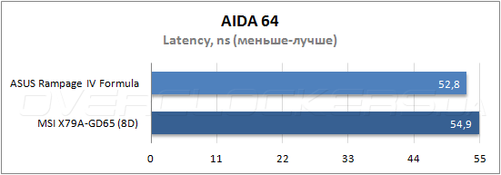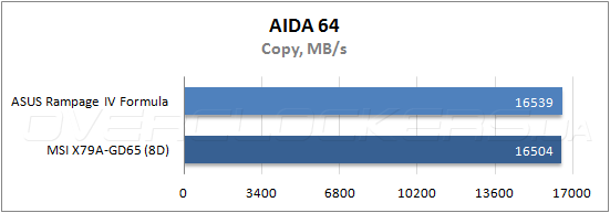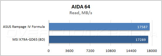 В бенчмарке памяти AIDA 64 протестированные материнские платы в целом показали сравнимые результаты, однако решение от ASUS всё же оказалось быстрее во всех тестах за исключением записи.