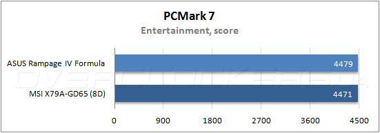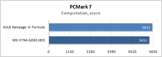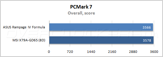 В приложении PCMark 7 мы снова наблюдаем практически ту же ситуацию, что в целом не удивительно, учитывая, что современные материнские платы не имеют собственного контролера памяти. В бенчмарках Overall и Productivity преимущество одержала MSI X79A-GD65 (8D), а в остальных трёх тестах лидером стал продукт от ASUS.