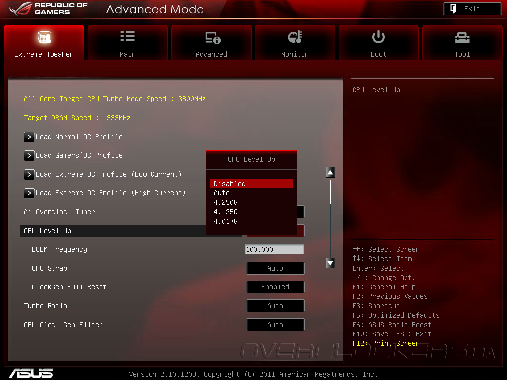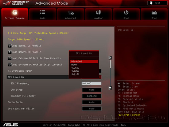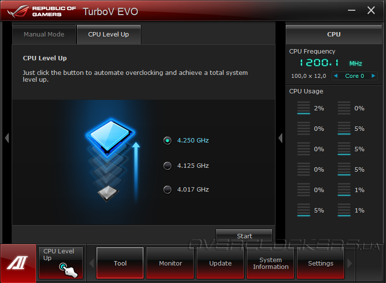 Если пользователь не обладает достаточным опытом или не хочет вдаваться в тонкости ручного оверклокинга, но всё же хочет ускорить систему и повысить уровень быстродействия, разработчики предлагают ему воспользоваться опциями автоматического разгона системы. Функция под названием CPU Level UP состоит в том, что пользователь лишь выбирает итоговую частоту CPU, которую ему необходимо достигнуть в процессе разгона (4250, 4125 или 4017 МГц), а система автоматически подбирает все остальные параметры.